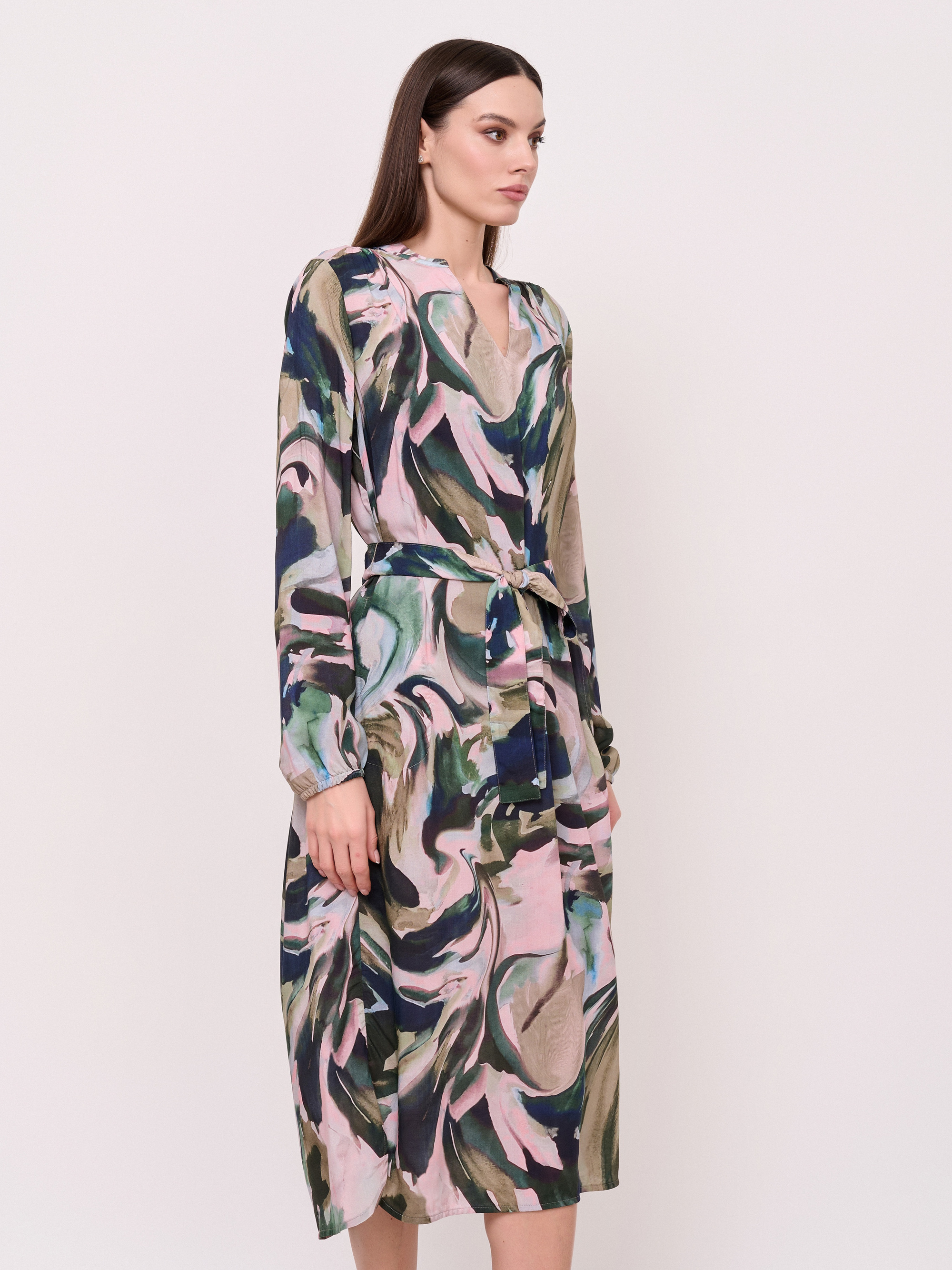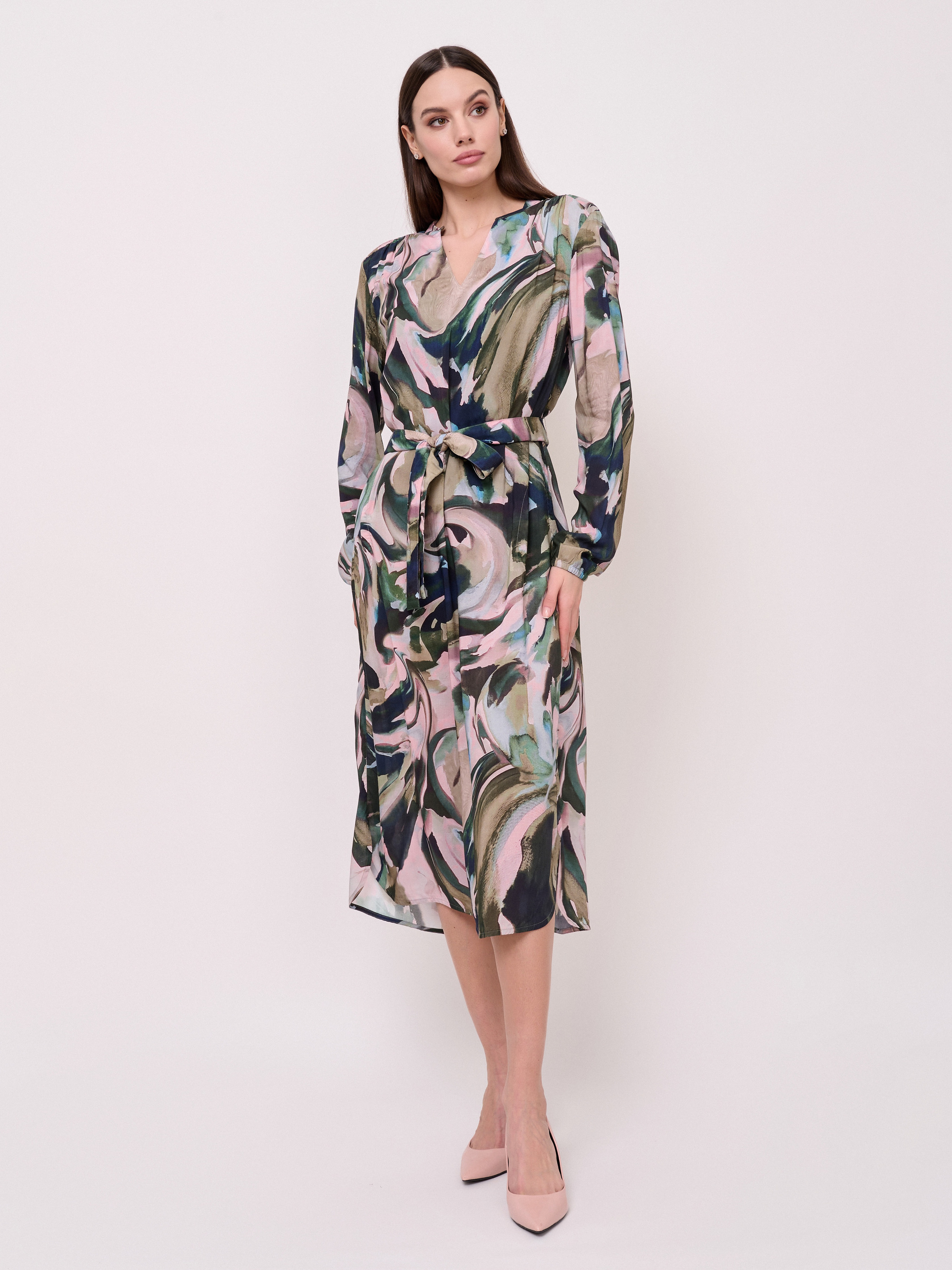 Детали: без застежки, вырез горловины замочная скважина, рукава длинные, покрой прямой, рисунок абстракция, карманы в шве, конструктивные элементы боковые разрезы, длина платья миди, пояс из основной ткани. Длина по спинке: 117 см.
