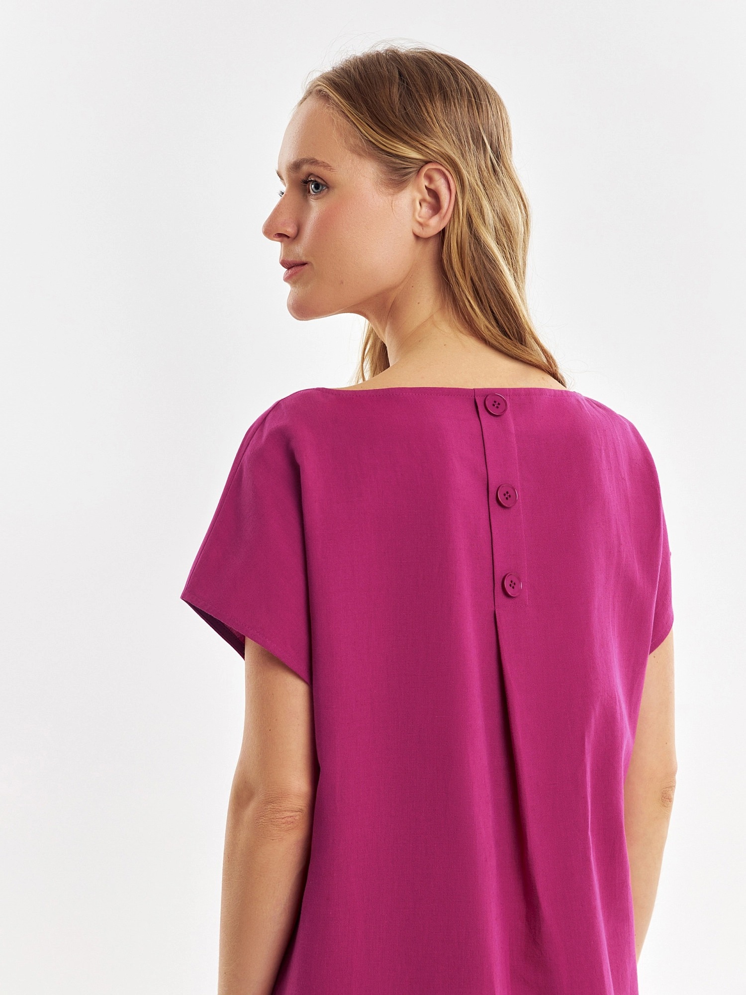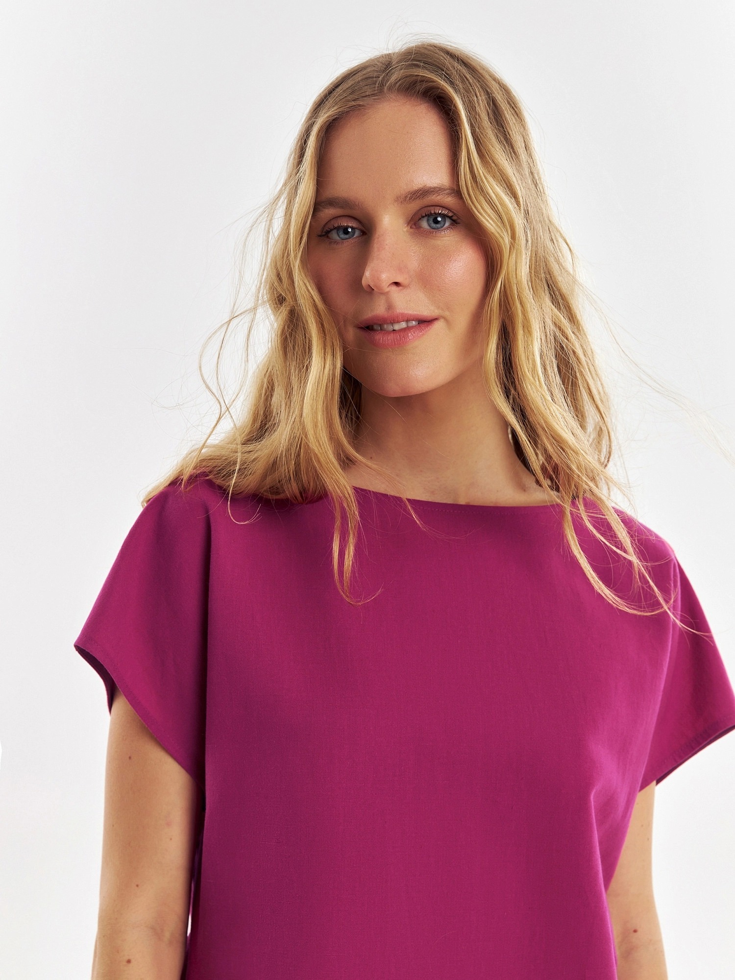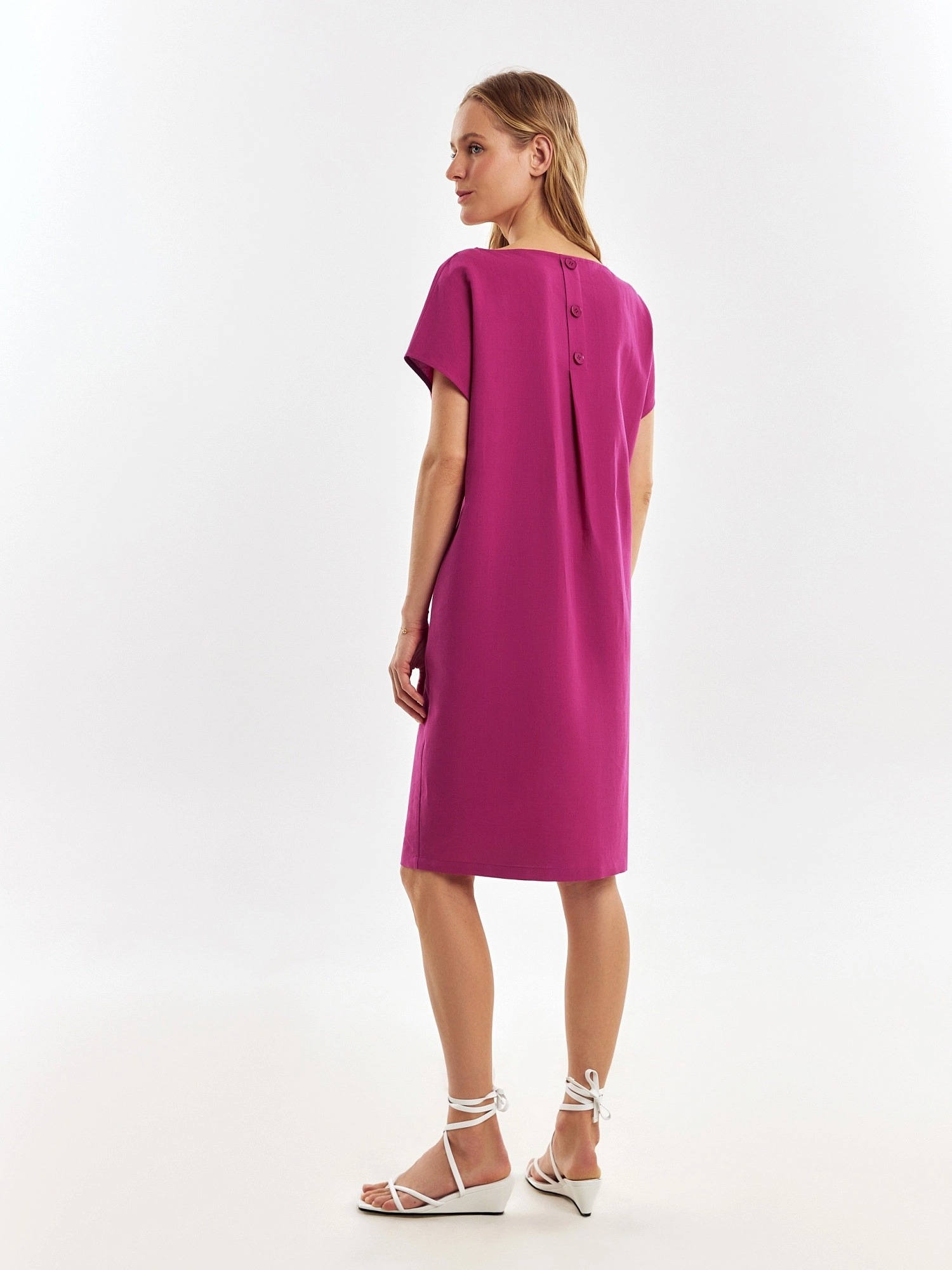 Платье-кокон с горловиной лодочкой, складкой на спине и планкой с имитацией пуговиц. Платье длиной до колена из льняной ткани в ярком цвете цикламен.