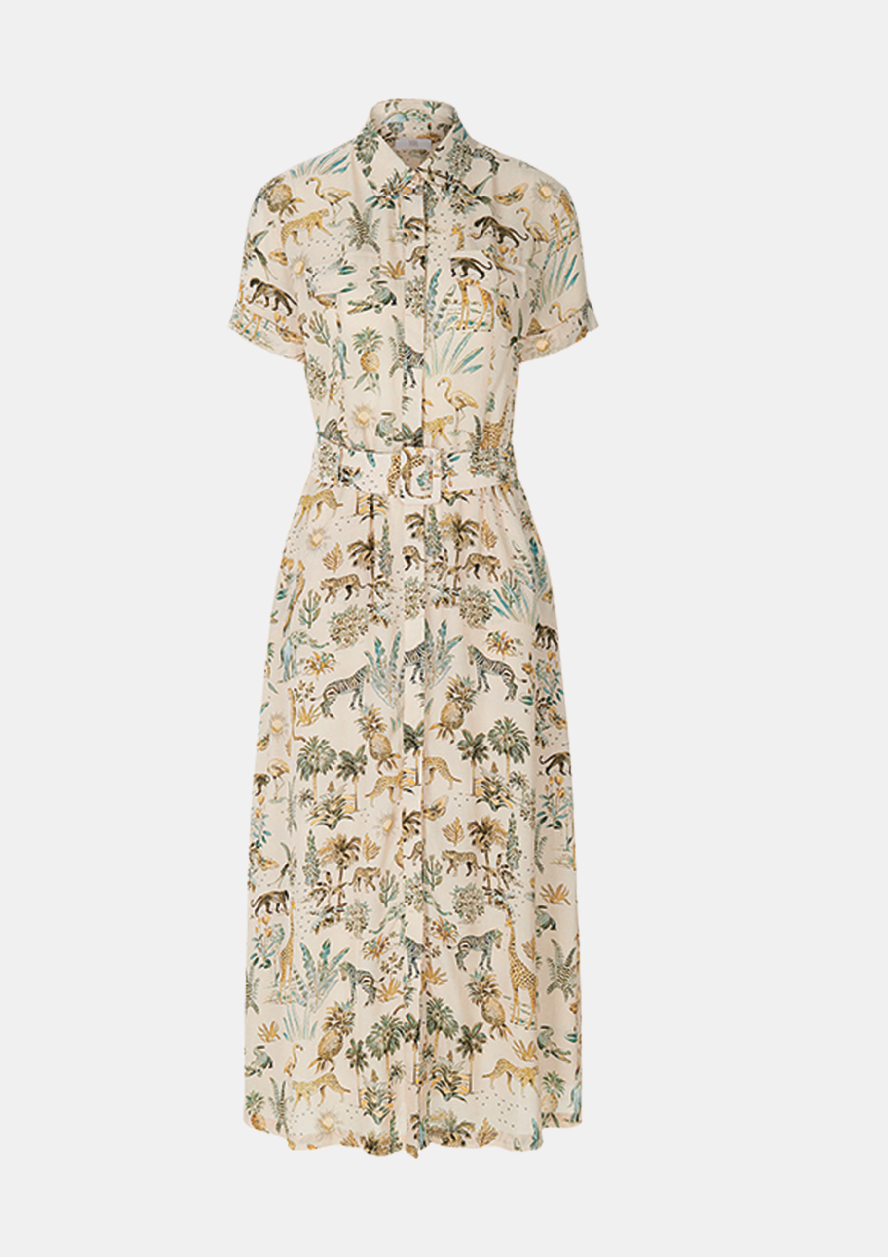 Платье-рубашка модной длины миди с короткими рукавами, поясом и расклешенным силуэтом. Настоящая классика моды, представленная здесь в эксклюзивном принте Safarino на чистой вискозе.