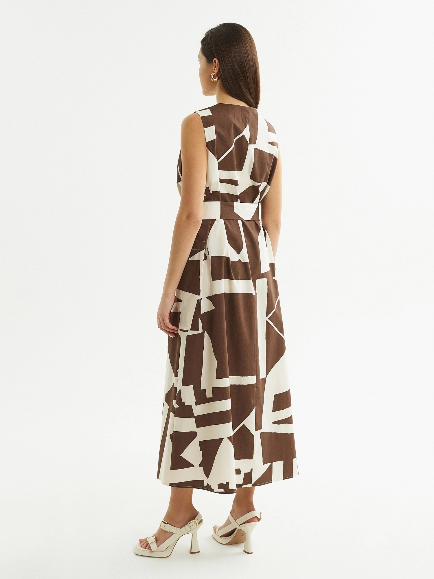 Стильное платье без рукавов из хлопковой ткани свободного А-силуэта длины миди с V-образным вырезом горловины и крупными накладными карманами. В комплект входит съемный пояс из ткани для создания более приталенного силуэта.