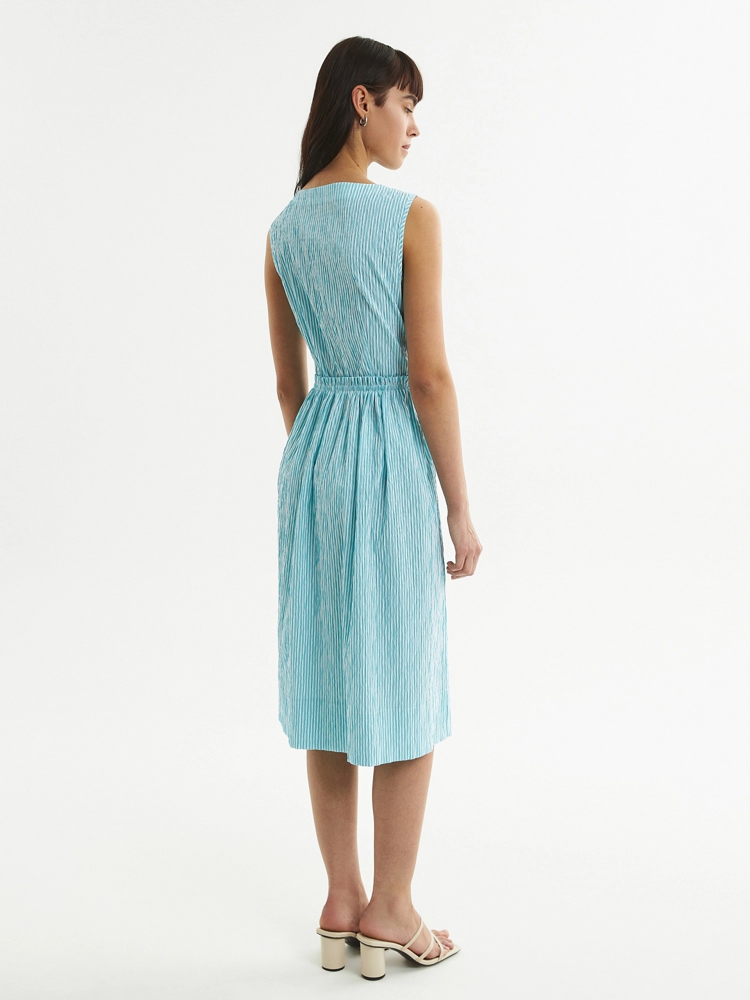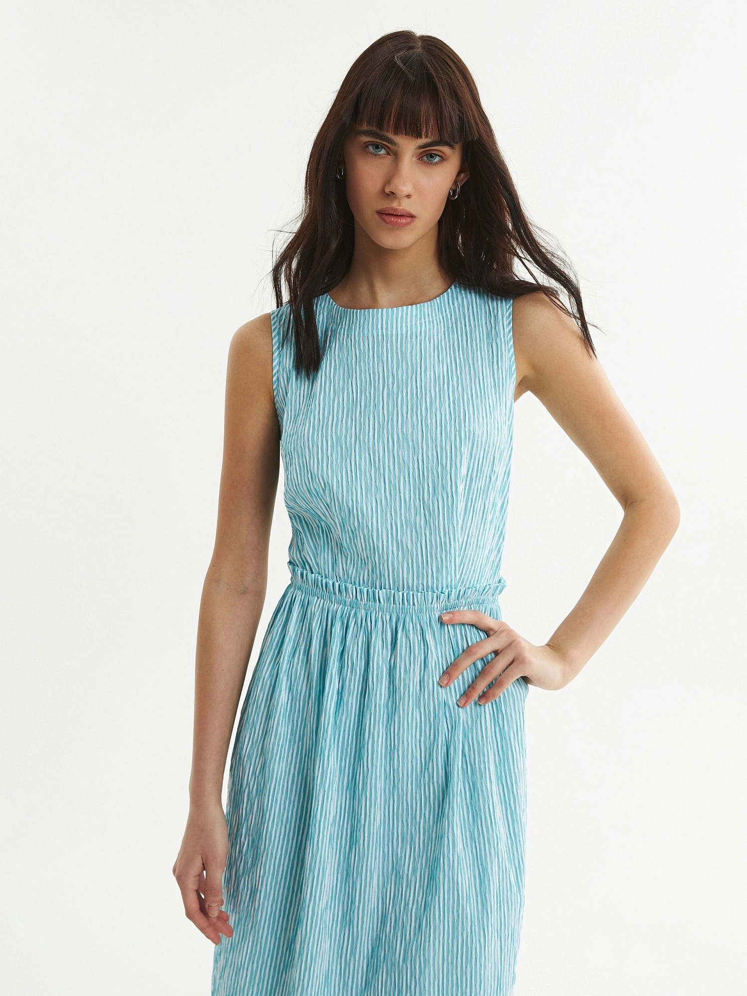 Романтичное приталенное платье без рукавов, из фактурной плательной ткани с бирюзовой полоской. С расширенной юбкой на резинке и рюшем на талии.