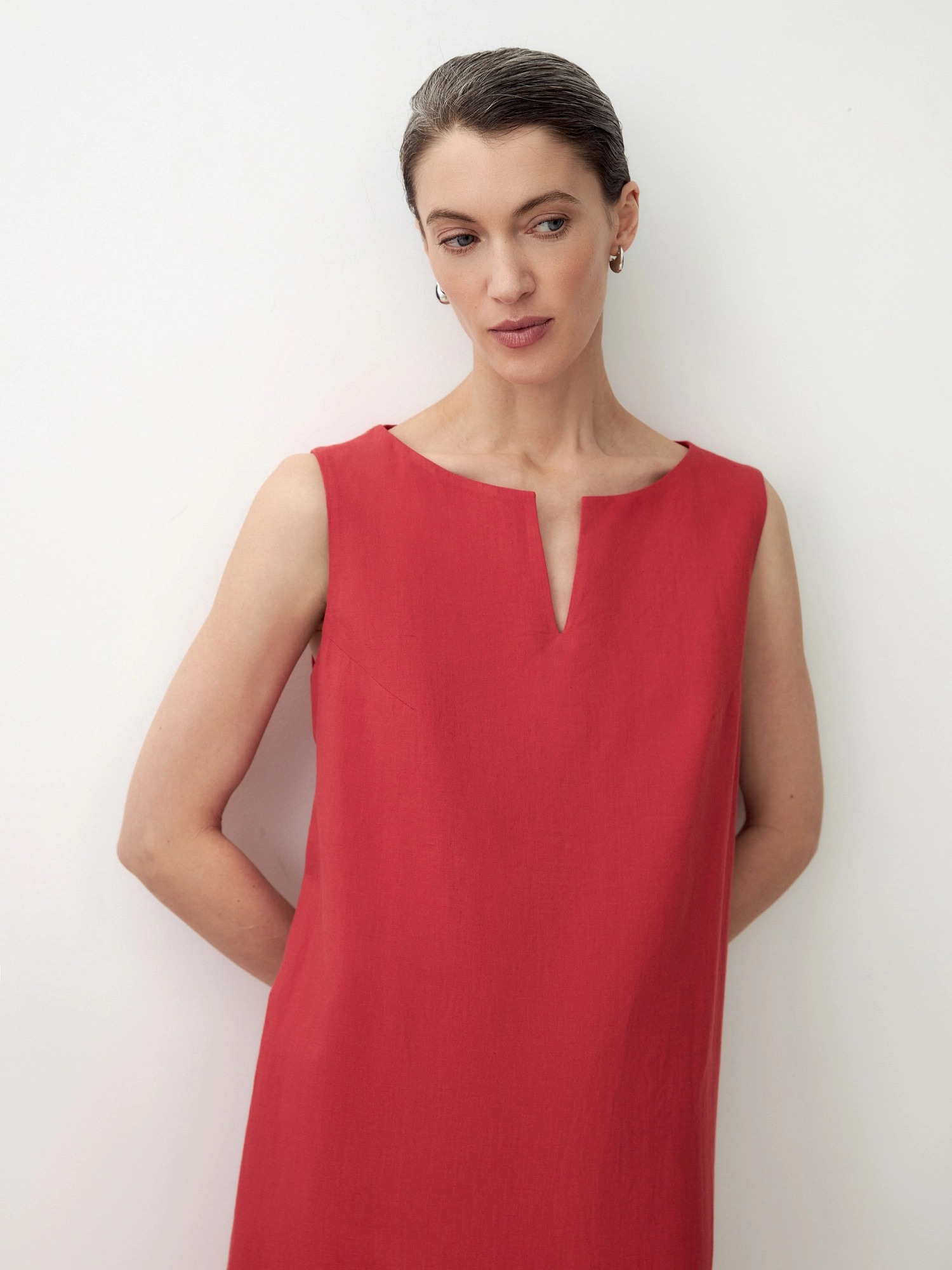 Платье трапеция из льняной ткани с круглой горловиной и небольшим разрезом по переду. В боковых швах потайные карманы.