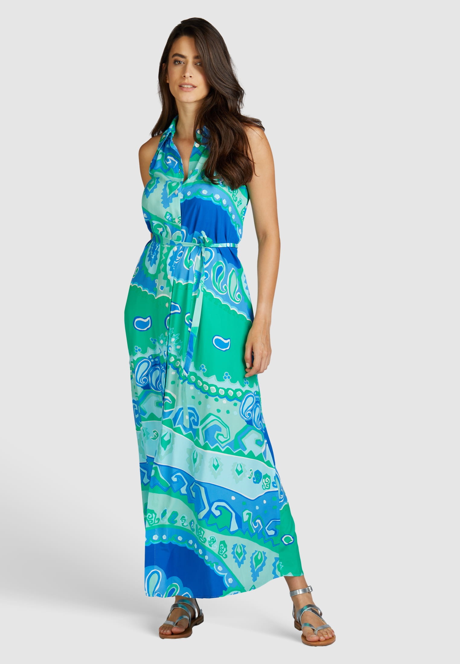 Платье макси, выполненное из особенно мягкой вискозы, обеспечивает максимальный комфорт. Модель повседневного кроя с классическим блузочным воротником и планкой на пуговицах во всю длину. Платье с модным тропическим принтом и практичным поясом станет незаменимым аксессуаром.