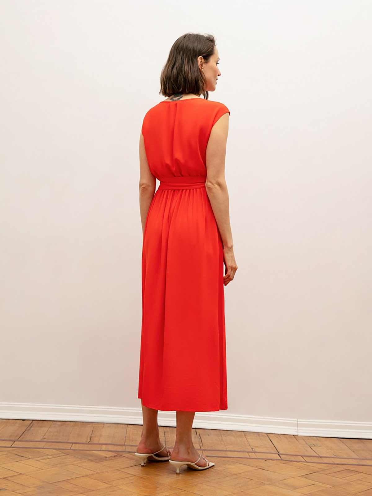 Платье без рукавов длины миди выполнено в сочной расцветке. Круглый вырез горловины украшен складками. Платье прямого силуэта с тканевым поясом в комплекте. Платье хорошо сочетается как с каблуком, так и с кроссовками.