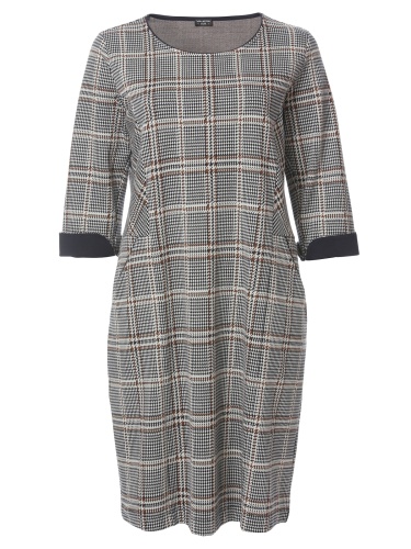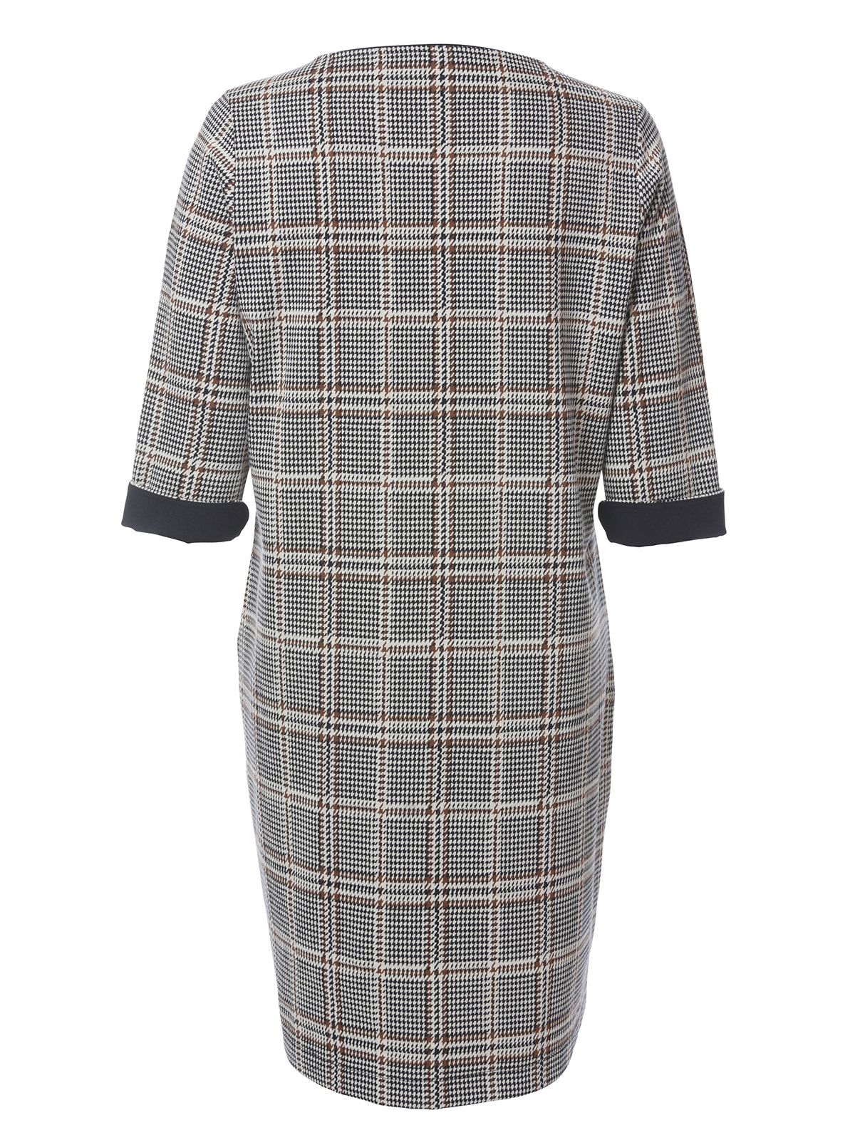 Клетчатое платье миди подойдет для повседневного или делового образа. Полуприталенный силуэт, овальный вырез горловины. Втачной рукав 3/4 с манжетами.