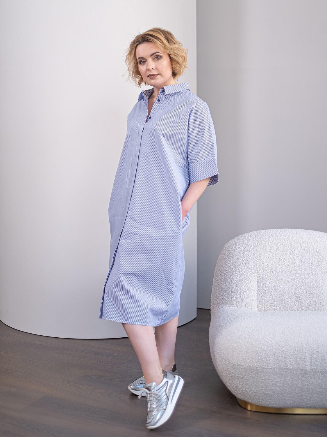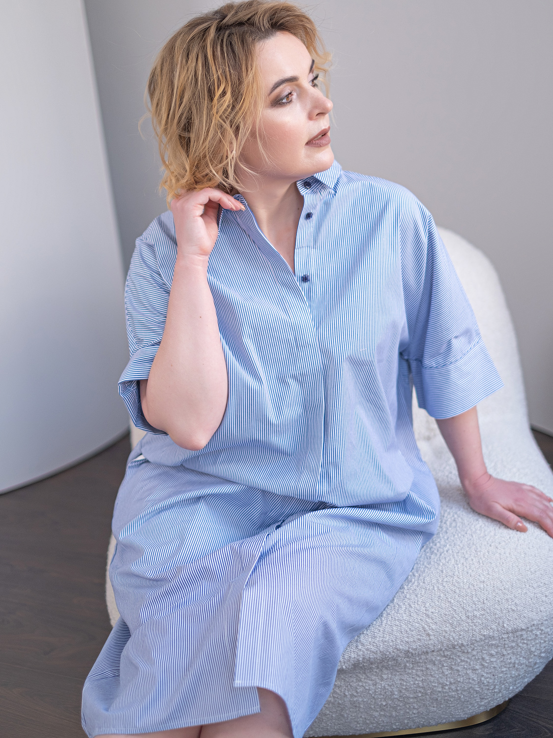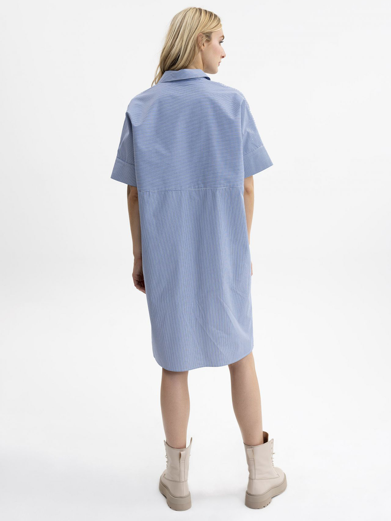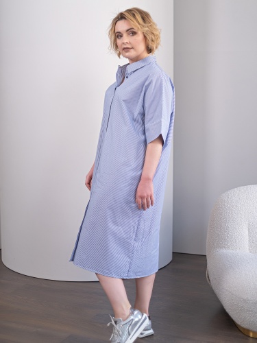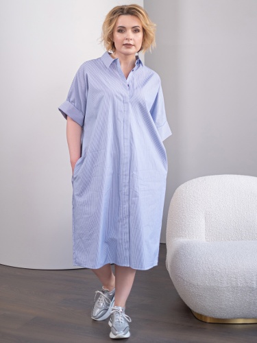 Хлопковое платье-рубашка свободного кроя. Длина миди. Отложной рубашечный воротник. Короткий втачной рукав с отворотом. Застежка на пуговицы.