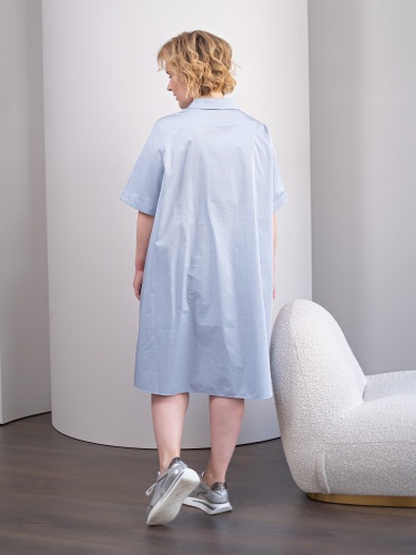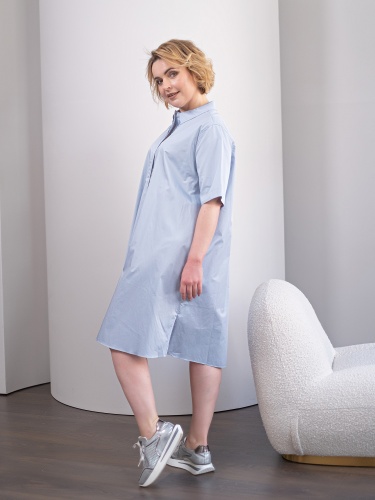 Хлопковое платье-рубашка свободного кроя. Длина миди. Отложной рубашечный воротник. Короткий втачной рукав с отворотом. Застежка на пуговицы.