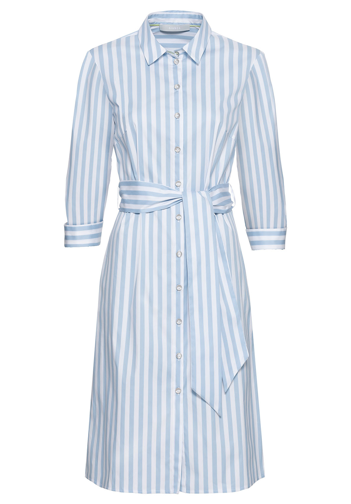 Современное и всегда актуальное. Повседневное платье-рубашка Dilana из приятной хлопково-эластановой ткани в полоску - абсолютный модный универсал. Современный дизайн с рубашечным воротником, непрерывной пуговичной планкой и рукавом 3/4. Галстук-пояс на талии подчеркивает достоинства фигуры. Платье в полоску - универсальный предмет гардероба, его можно носить даже с кроссовками. Платье выглядит благородно как с кожаной, так и с джинсовой курткой. • платье-рубашка • планка с пуговицами • пояс • смесь хлопка с эластаном • рубашечный воротник, рукава 3/4, прямой крой • длина юбки около 68 см; рост модели около 180 см • при росте 168 см платье будет закрывать колени
