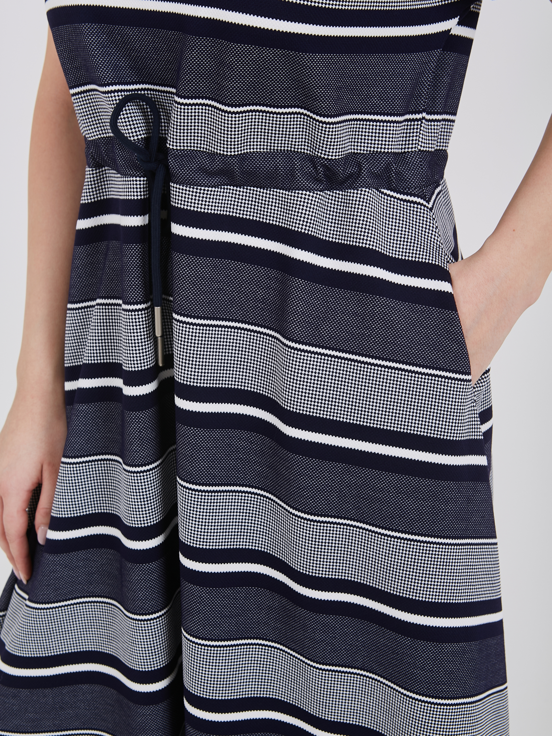Платье имеет свободный крой с короткими рукавами и яркий полосатый рисунок в темных тонах, создающий стильный и комфортный образ. Дополнено декоративной брошью на груди и карманами, оно идеально подходит для повседневной носки. Коллекция Весна-Лето 2025. Капсула "Самарканд". Параметры модели: 95-64-101, рост 175, размер 44-46