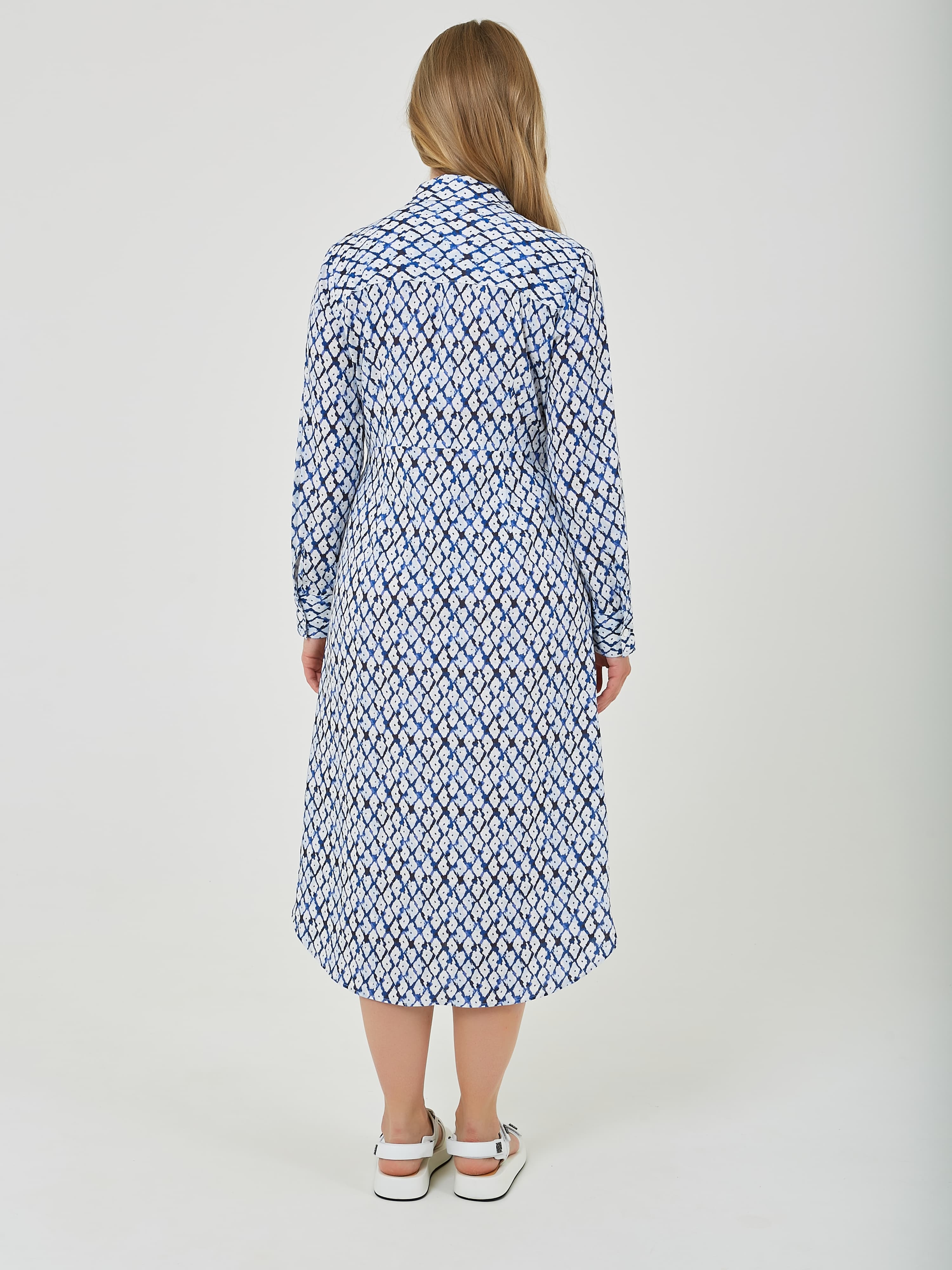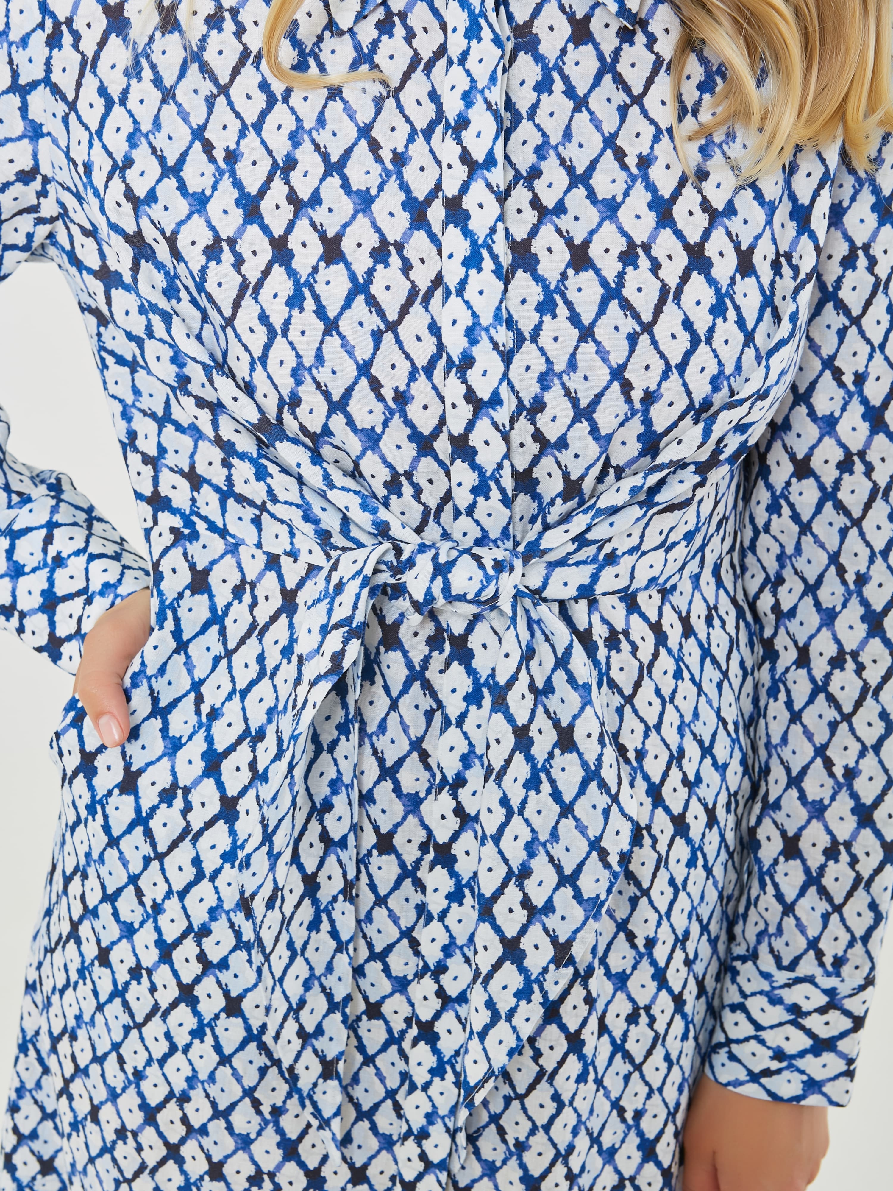 Платье с длинными рукавами и воротником выполнено из легкой ткани с геометрическим узором в синем и белом цветах, что придает ему свежий и стильный вид. Акцент на талии с помощью завязки создает женственный силуэт, идеально подходящий для теплой погоды. Коллекция Весна-Лето 2025. Капсула "Санторини". Параметры модели: 89-70-92, рост 167, размер 44-46