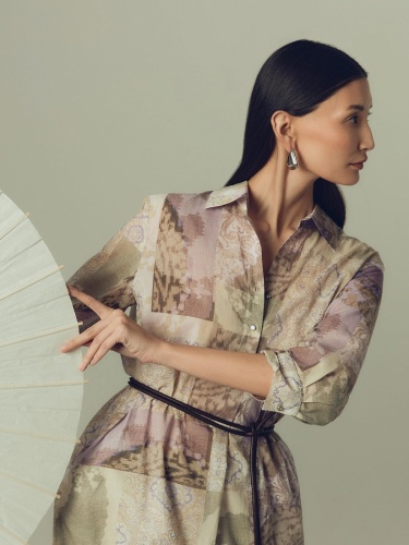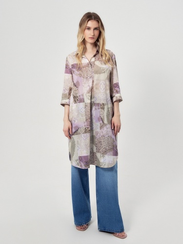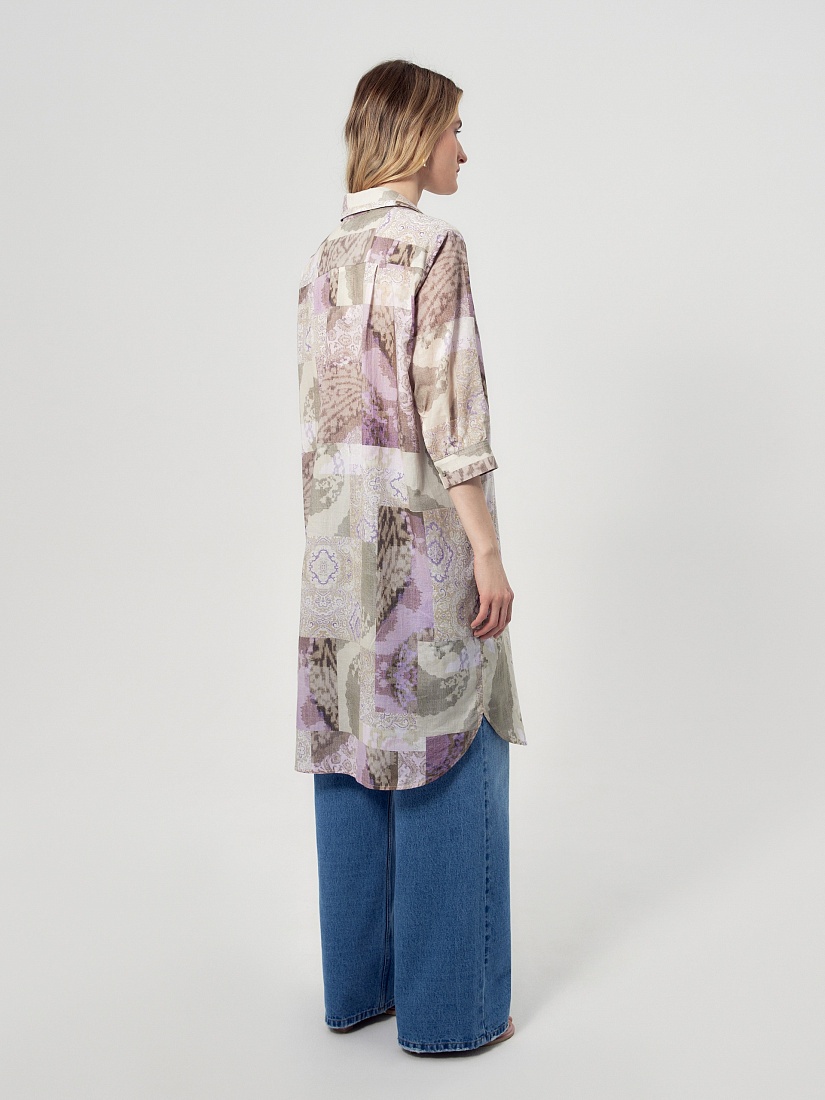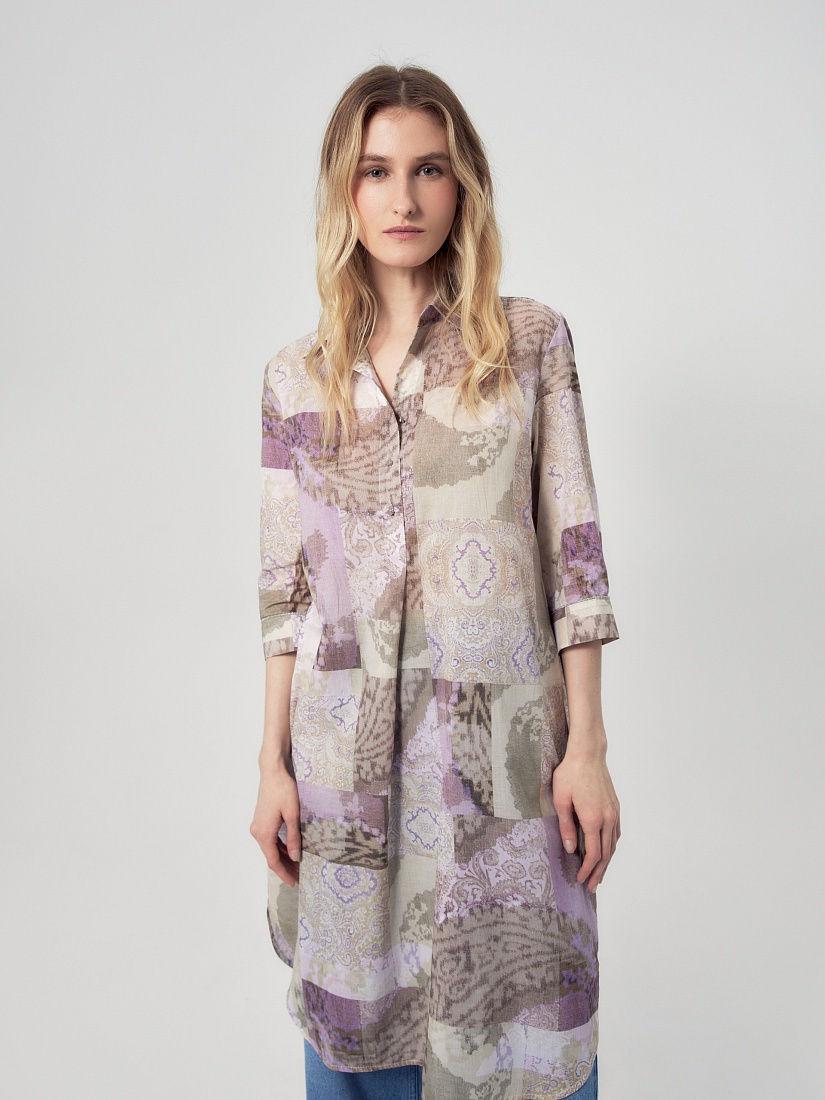 Прямое платье блузочного силуэта с отложным воротником и укороченной планкой на пуговицах. Платье выполнено из тонкой хлопковой ткани с этническим принтом в технике пэчворк. Классический втачной рукав длиной 3/4 на манжете с декоративной тесьмой мониль. Платье с разрезами по бокам.