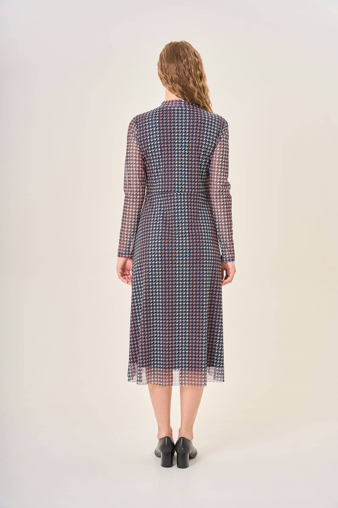 Платье с длинными рукавами и высоким воротником. Элегантный узор "гусиная лапка" в оттенках темно-синего, розового и белого придает образу изысканность и утонченность. Длина платья до середины икры создает гармоничный и привлекательный силуэт. Легкий струящийся материал приятно облегает фигуру, делая этот наряд идеальным выбором для особых случаев и романтических вечеров.
