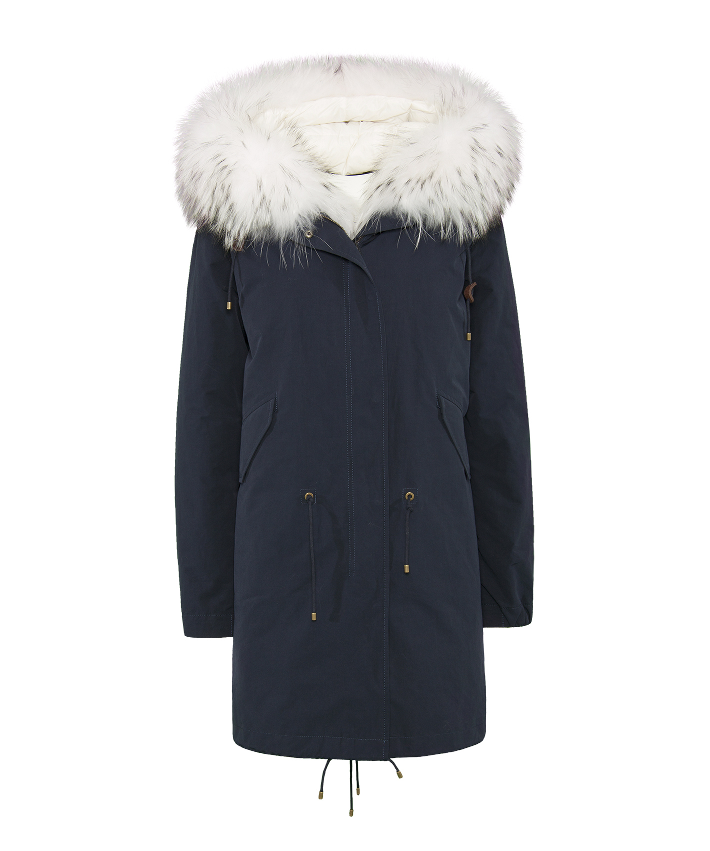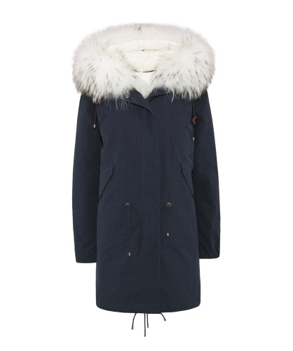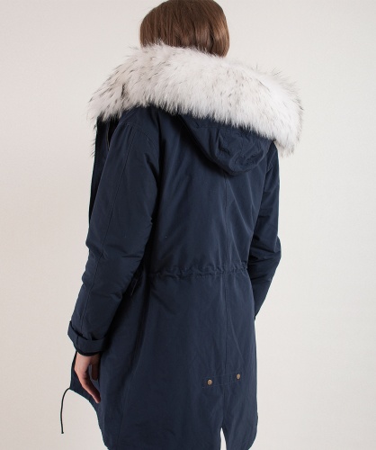 Теплое пуховое пальто. Плотная ткань верха. Прямой покрой, удлиненная спинка, кулиска на талии. Карманы пальто на клапанах. Кулиска по низу изделия. Оторочка капюшона из натурального меха енота.