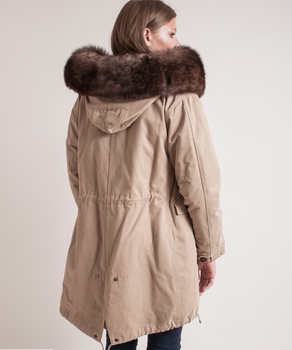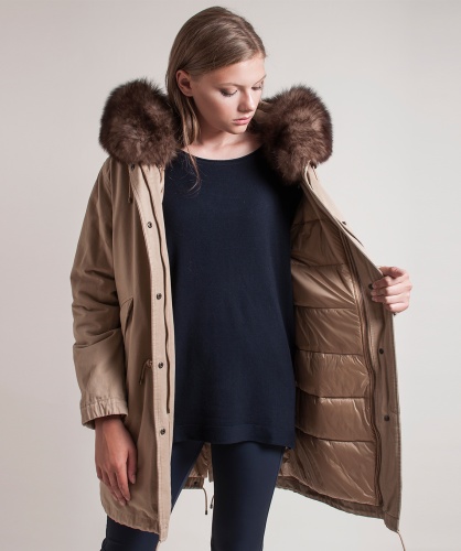 Теплое пуховое пальто прямого кроя. Плотная ткань верха. Кулиска на талии. Карманы пальто на клапанах. Пата с пуговицей по низу рукавов. Кулиска по низу изделия. Оторочка капюшона из натурального лисьего меха.