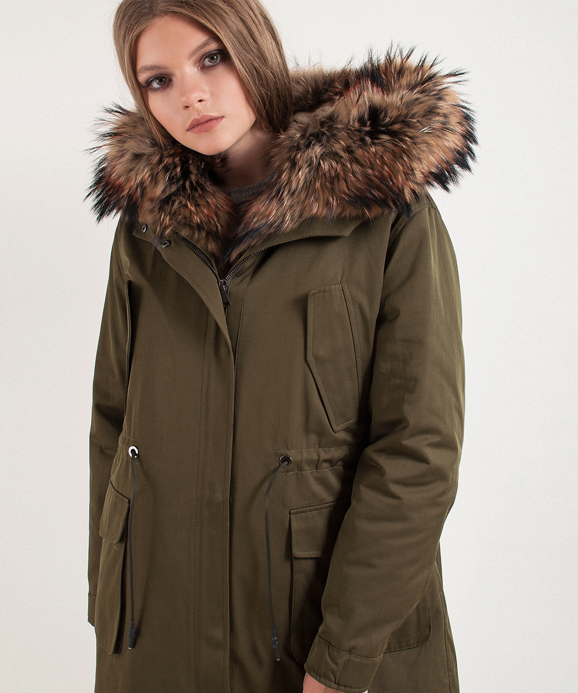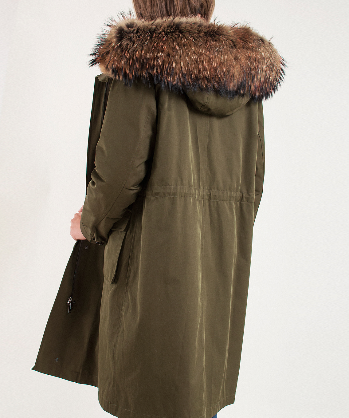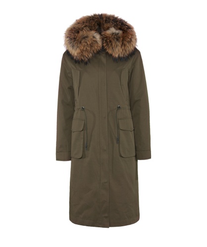 Теплая пихора, подкладка из меха кролика. Плотная ткань верха. Прямой покрой, кулиска на талии. Карманы на клапанах. Рукава оформлены патой на пуговице. Оторочка капюшона из натурального меха енота.