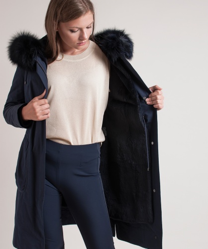 Теплая пихора на подкладке из меха кролика. Плотная ткань верха. Прямой покрой, кулиска с завышенной линией талии. Накладные карманы. Разрезы по бокам. Оторочка капюшона из натурального лисьего меха.