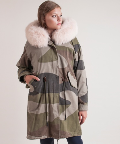 Теплая пихора с принтом под камуфляж. Плотная ткань верха. Прямой покрой, кулиска на талии. Удлиненная спинка. Разрез с задней части изделия, кулиска по низу. Отстегивающаяся подкладка из натурального меха кролика. Прорезные карманы на клапанах. Оторочка капюшона из натурального лисьего меха.