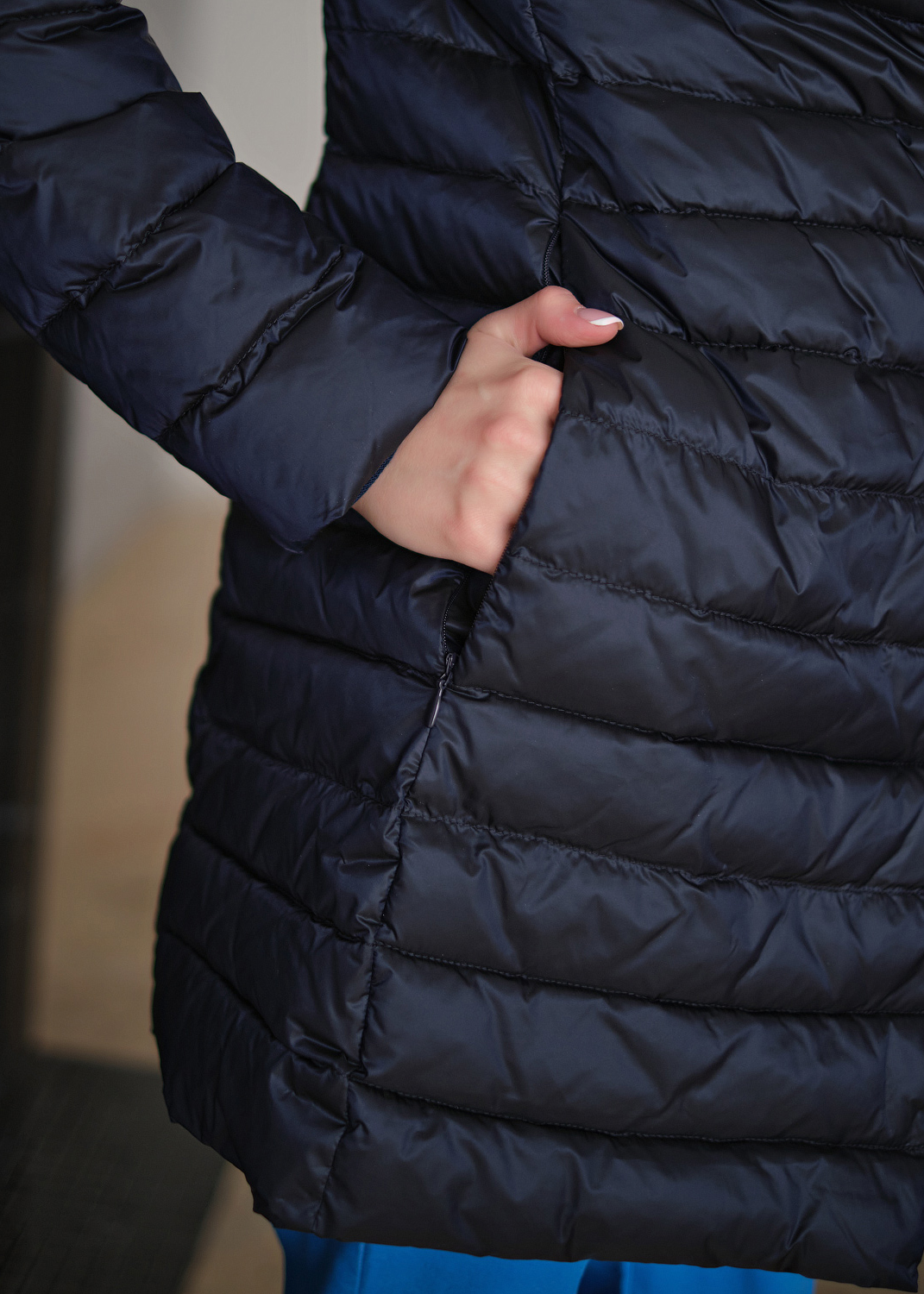 Стеганая однотонная куртка длиной до середины бедра. Глубокий капюшон, боковые карманы на молнии, втачной рукав полной длины. Представлена в синем и серебристом цвете.