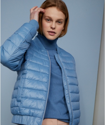 Куртка бомбер небесно голубого цвета станет частью как романтичного, так и спортивного образа. Втачной рукав полной длины с манжетой, воротник-стойка, врезные боковые карманы с листочкой.
