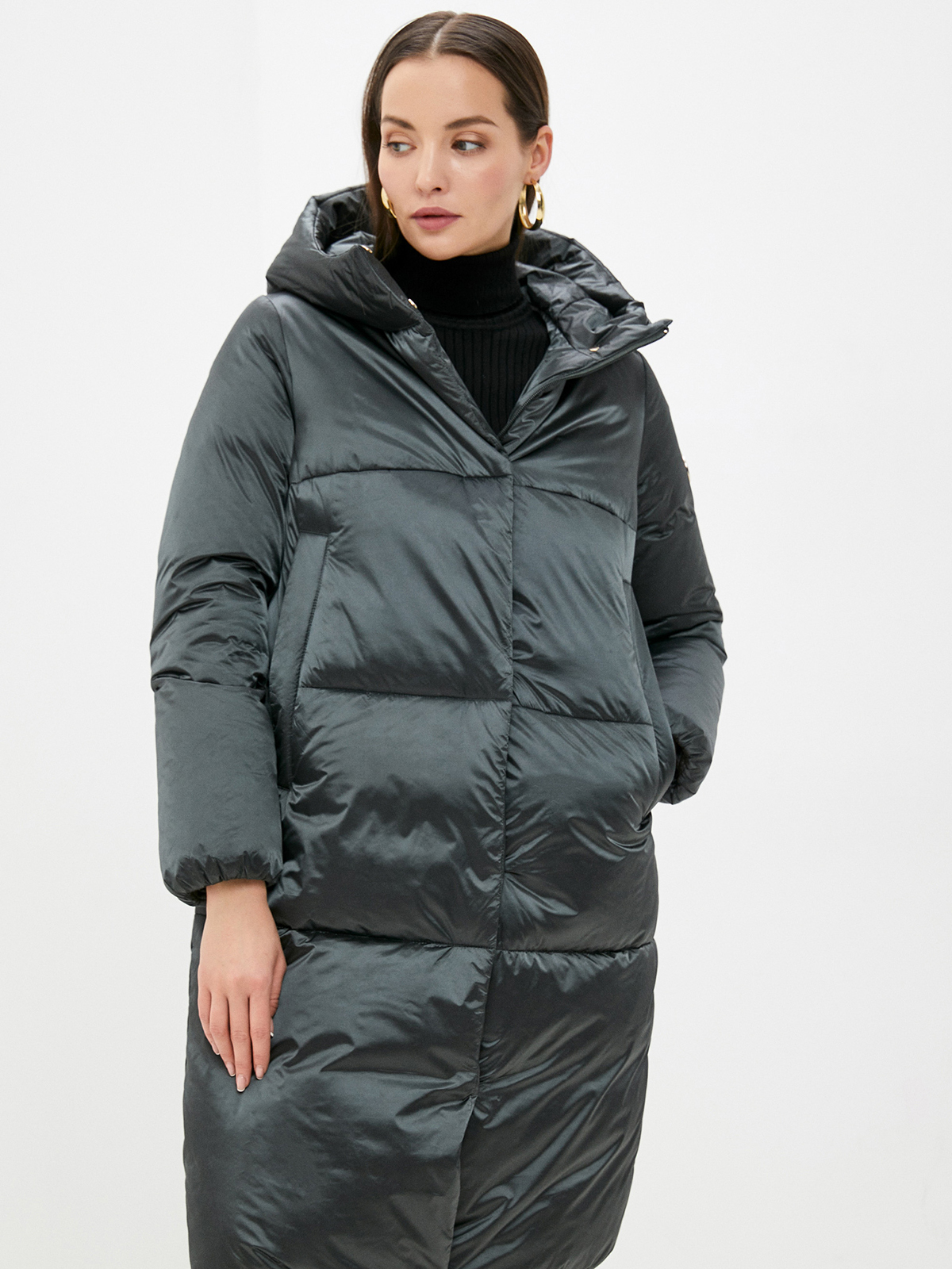 Стеганое пальто с наполнителем пух-перо. Застежка на молнии, ветрозащитный планка на кнопках, несъемный капюшон, боковые прорезные карманы с листочкой. Пальто хорошо защитит от холода и дополнит образ в городском стиле.