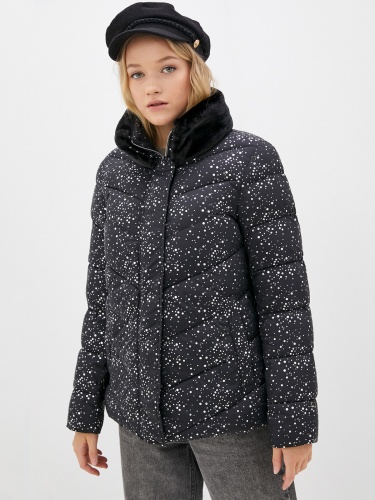 Стеганая куртка без капюшона с синтепоновым наполнителем. Стильный принт по всей поверхности изделия. Прямой силуэт универсален для любого типа фигуры. Воротник-стойка отделан искуственным мутоном. Застежка на скрытую молнию и кнопки. По бокам проперзные карманы с листочкой на кнопке.