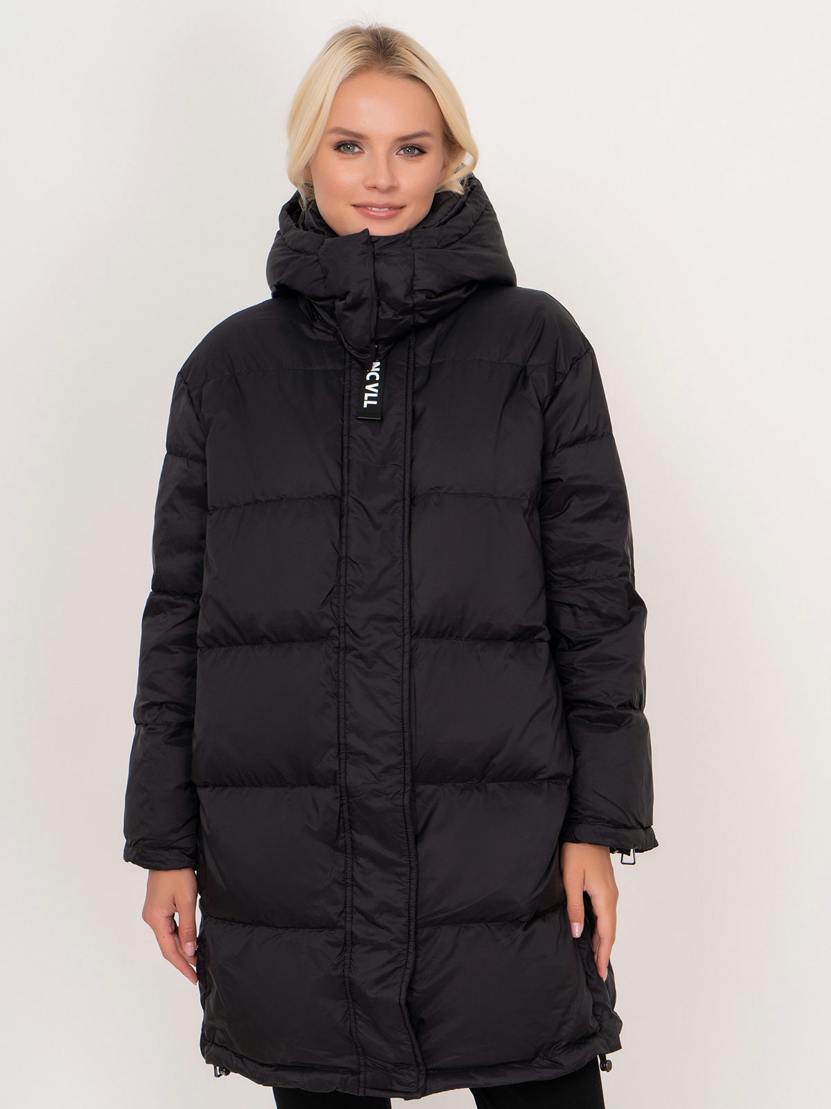 Стеганое однотонное пальто с пуховым наполнителем. Застежка на двойную молнию, ветрозащитная планка со скрытыми кнопками. Объемный капюшон, воротник стойка. Стильный базовый вариант пуховика, хорошо сочетается с различными нарядами.