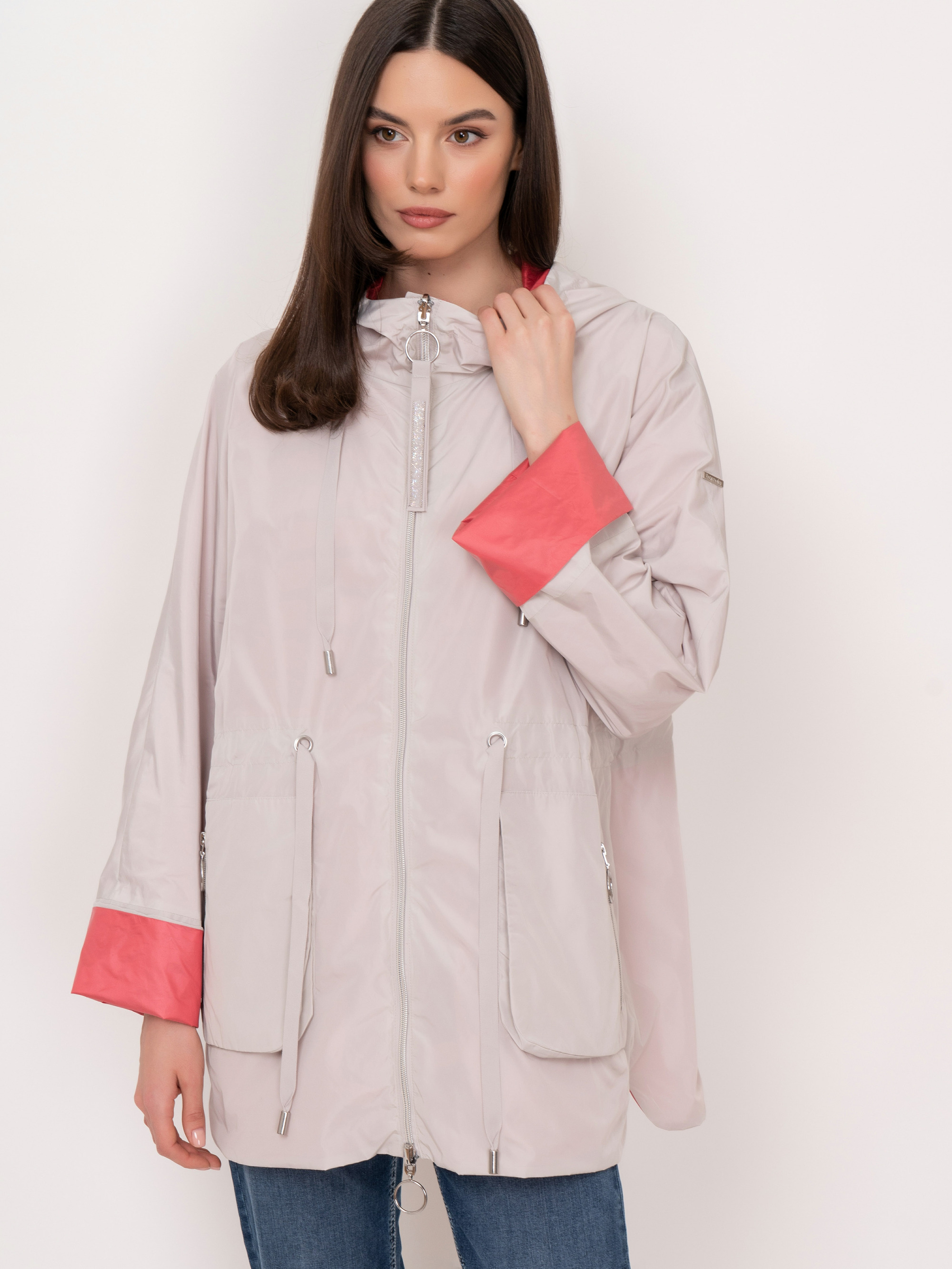 На сайте указаны российские размеры. Легкая двусторонняя куртка розового цвета, которую можно носить с обеих сторон. 2 боковых кармана на молнии. Регулировка талии кулиской. Рост модели: 175 см. Длина куртки: 76 см.