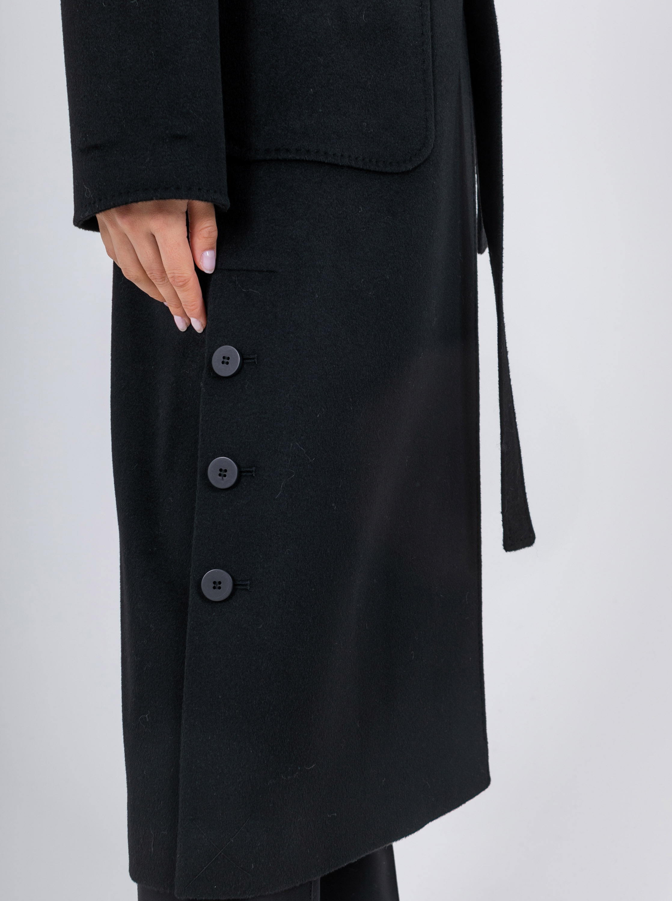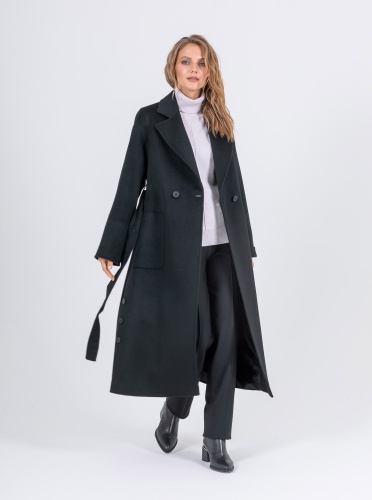 На сайте указаны российские размеры. Классическое строгое пальто из 100% шерсти. Прямой крой, английский воротник, большие наружные карманы, на пуговицах и поясе. Украшена модель тремя дополнительными пуговицами внизу вдоль бокового шва с 2-х сторон пальто. Рост модели: 174 см