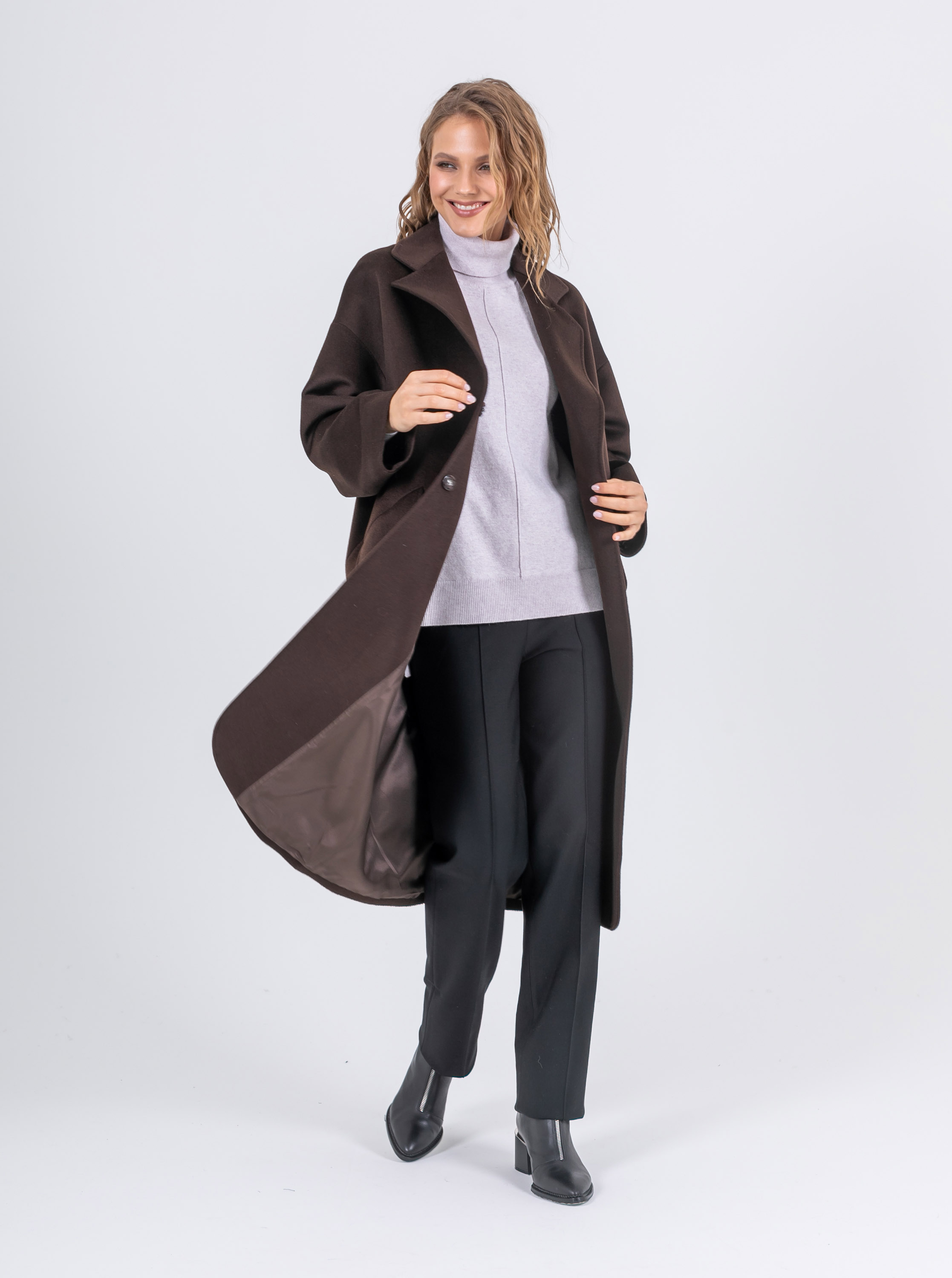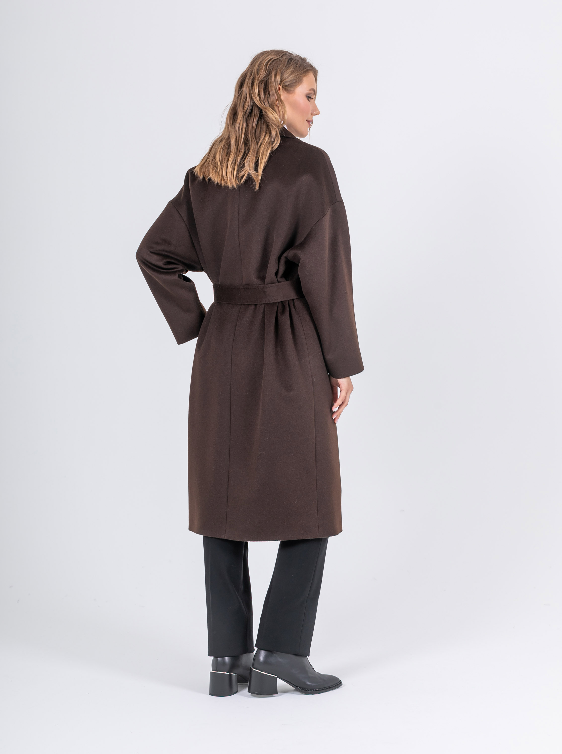 На сайте указаны российские размеры. Свободное пальто классического кроя из 100% шерсти. Свободный рукав, спущенное плечо, скрытые карманы, английский воротник. Модель с закруглёнными углами снизу. С поясом. Рост модели: 174 см