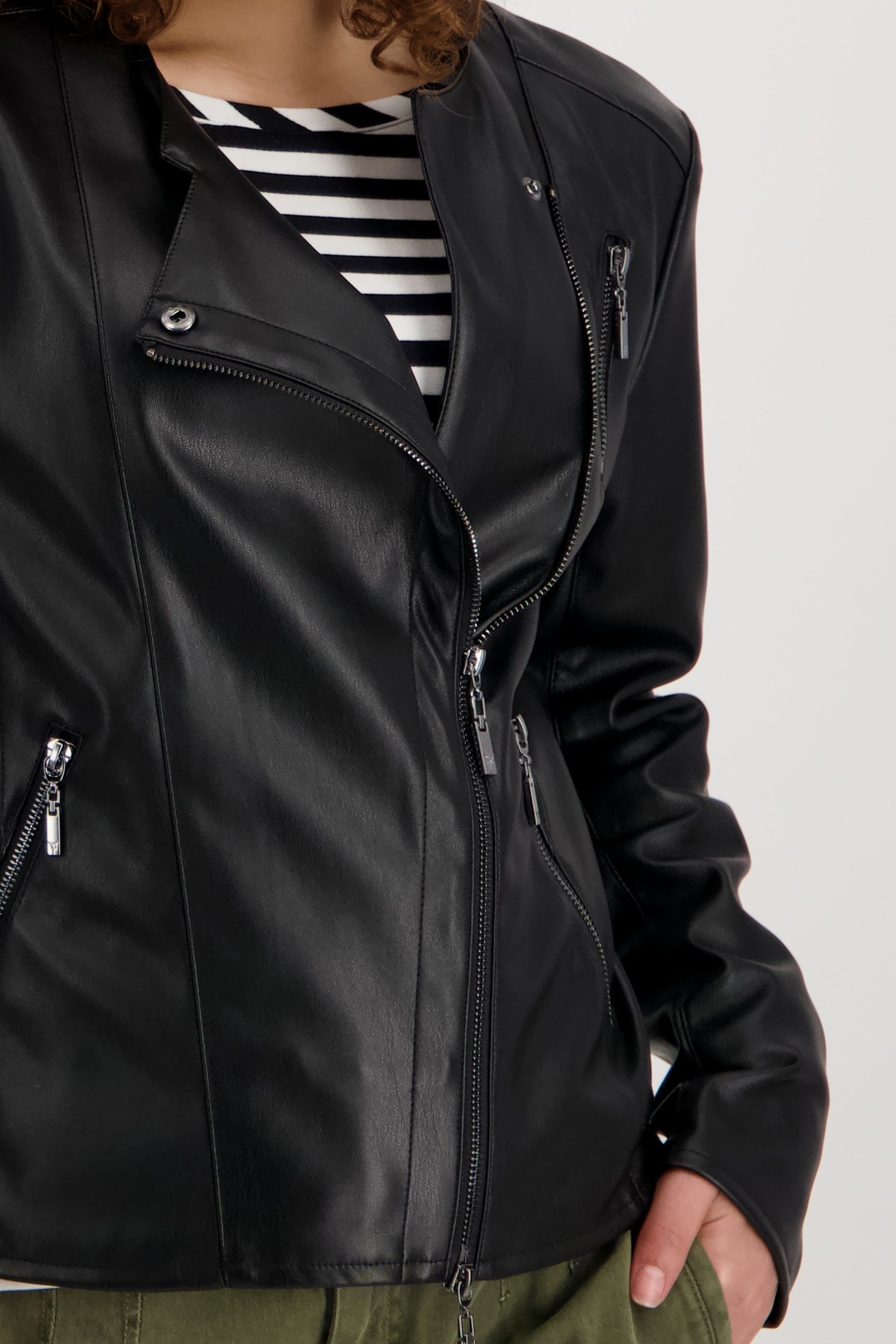 На сайте указаны российские размеры. Куртка в байкерском стиле из мягкой искусственной кожи с длинными рукавами. Прямой крой с круглым вырезом. Куртка украшена продольными разделительными швами на рукавах, переде и спинке, швами «принцесса» и плечевыми кокетками. Концы рукавов отделаны разрезом и молнией, а передняя часть имеет двустороннюю смещенную молнию, боковые прорезные карманы на молнии и дополнительный ложный карман на молнии на уровне груди. Рост модели 174 см Длина по спинке 44 размера составляет 58 см, а по переду – 74 см.