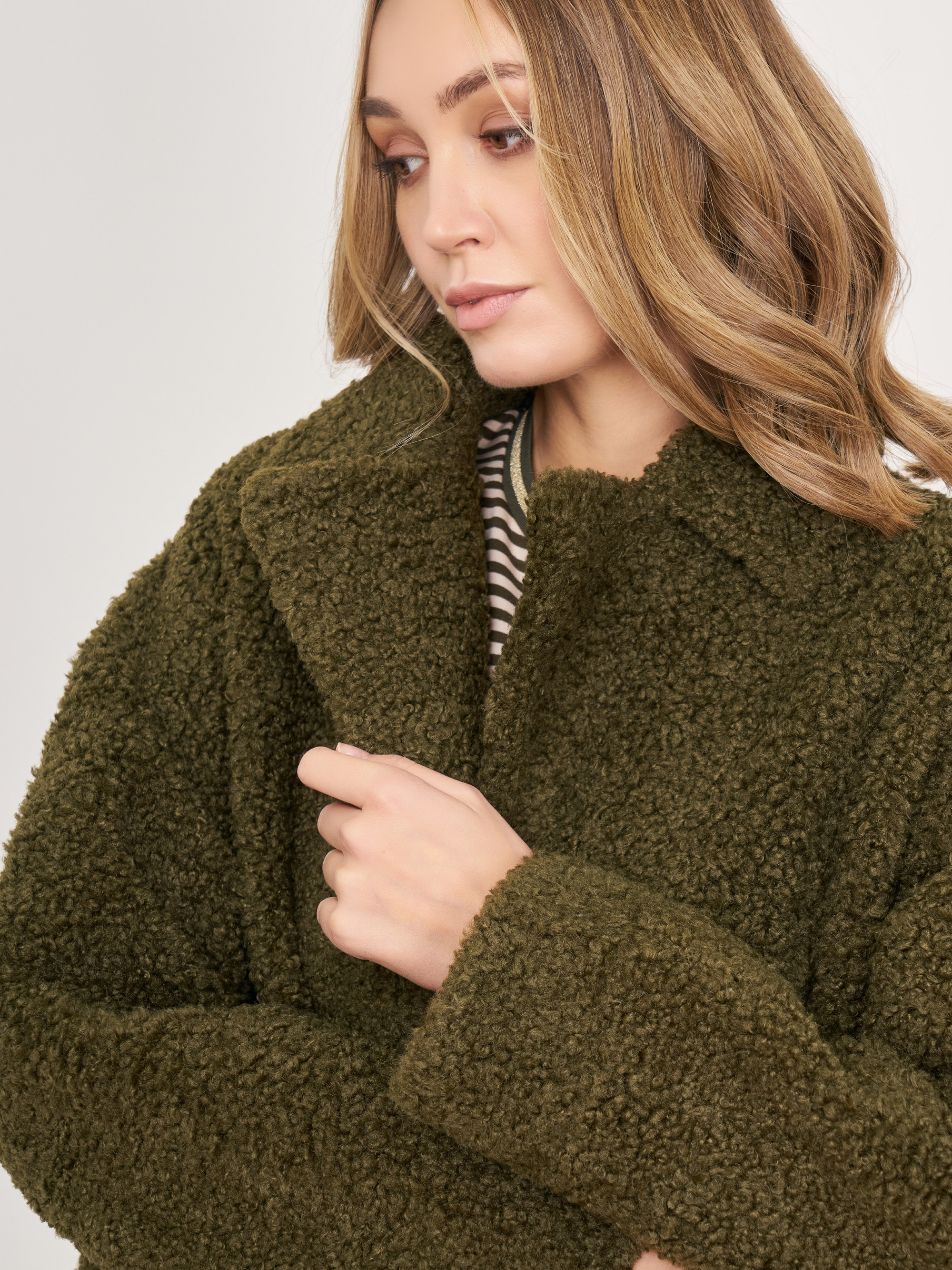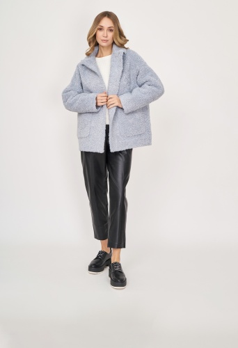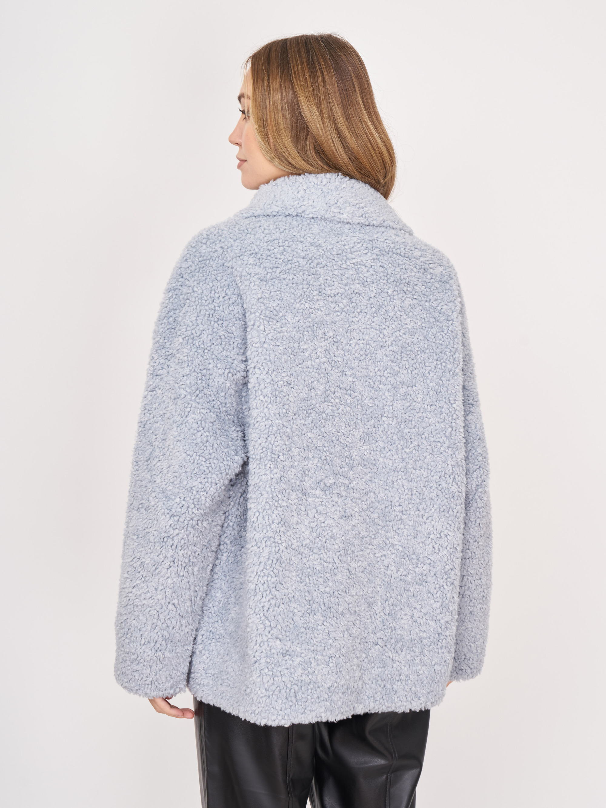 На сайте указаны российские размеры. Прямая двусторонная куртка из искусственного меха на кнопках, с отложным воротником, накладными карманами и с длинным рукавом. Представлена в голубом и хаки цветах. Длина по спинке: 70 см Рост модели: 175 см