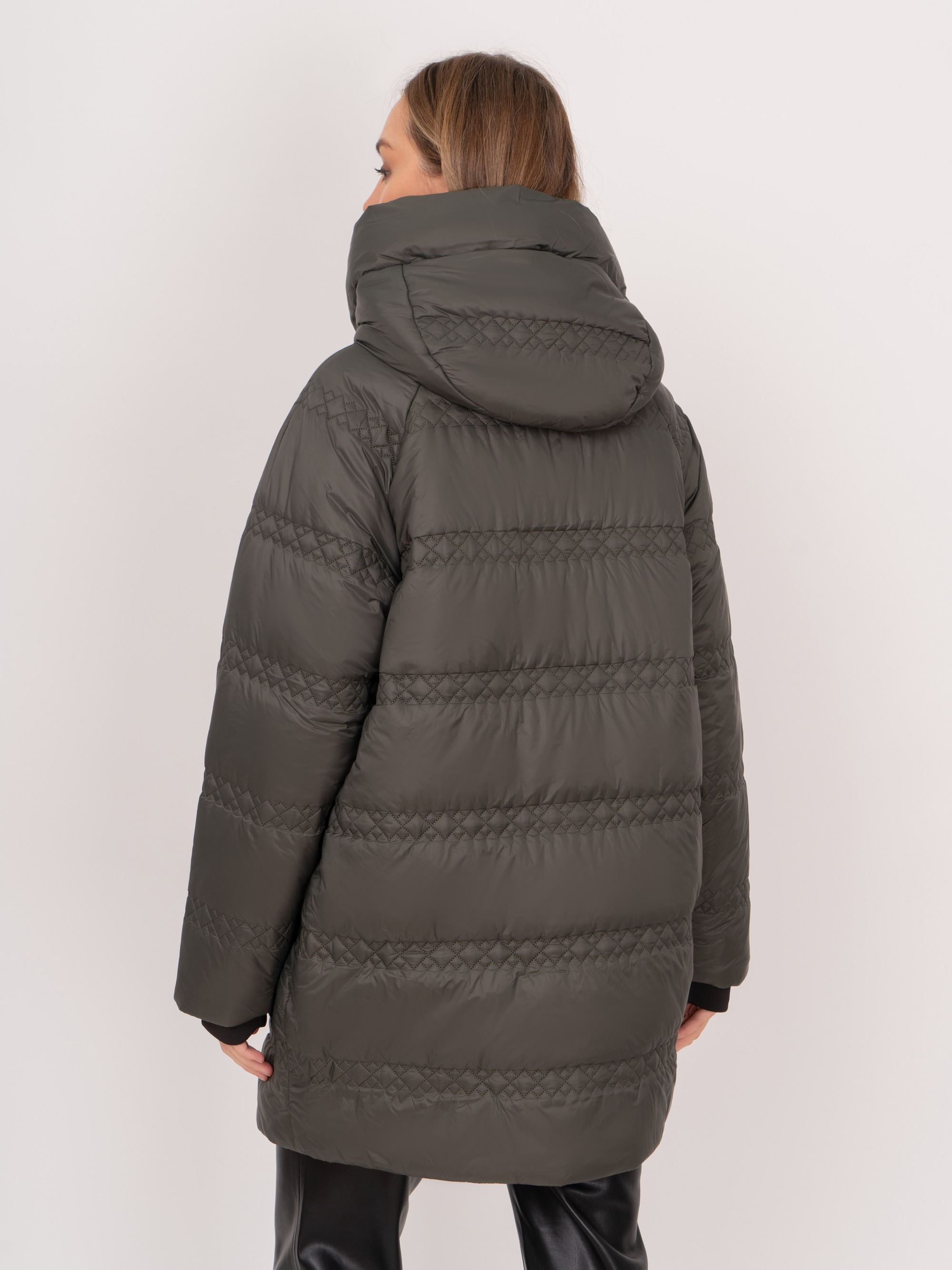 На сайте указаны российские размеры. Утепленная прямая хаки куртка на молнии и кнопках, с капюшоном, с прорезными карманами, с вышивкой. Длина по спинке: 79 см. Рост модели: 175 см.