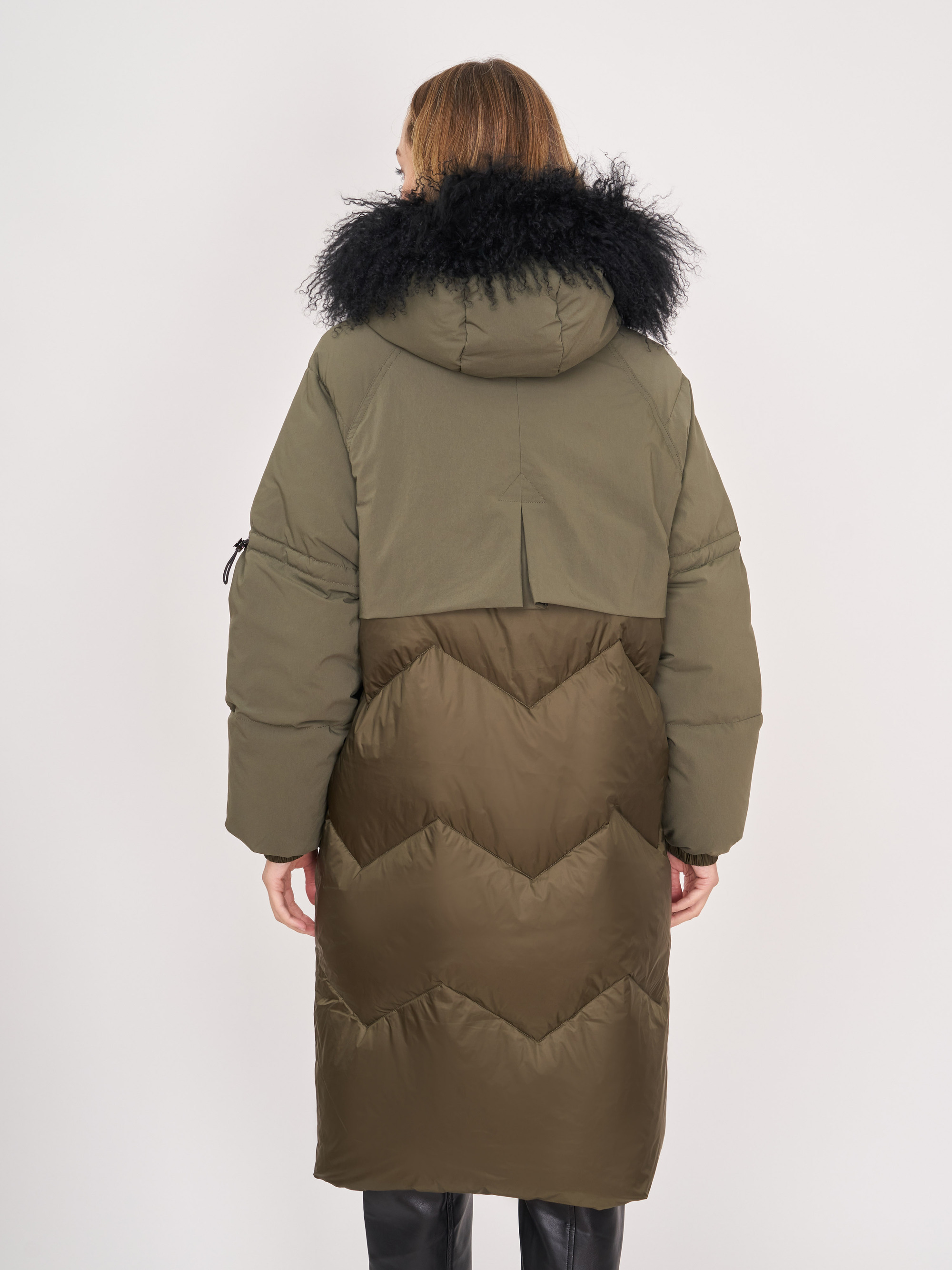 На сайте указаны российские размеры. Прямое утепленное хаки пальто на молнии и кнопках, с несъемным капюшоном, со съемной опушкой, с длинным рукавом с кулиской, с накладными карманами. Длина по спинке: 99 см. Рост модели: 175 см.
