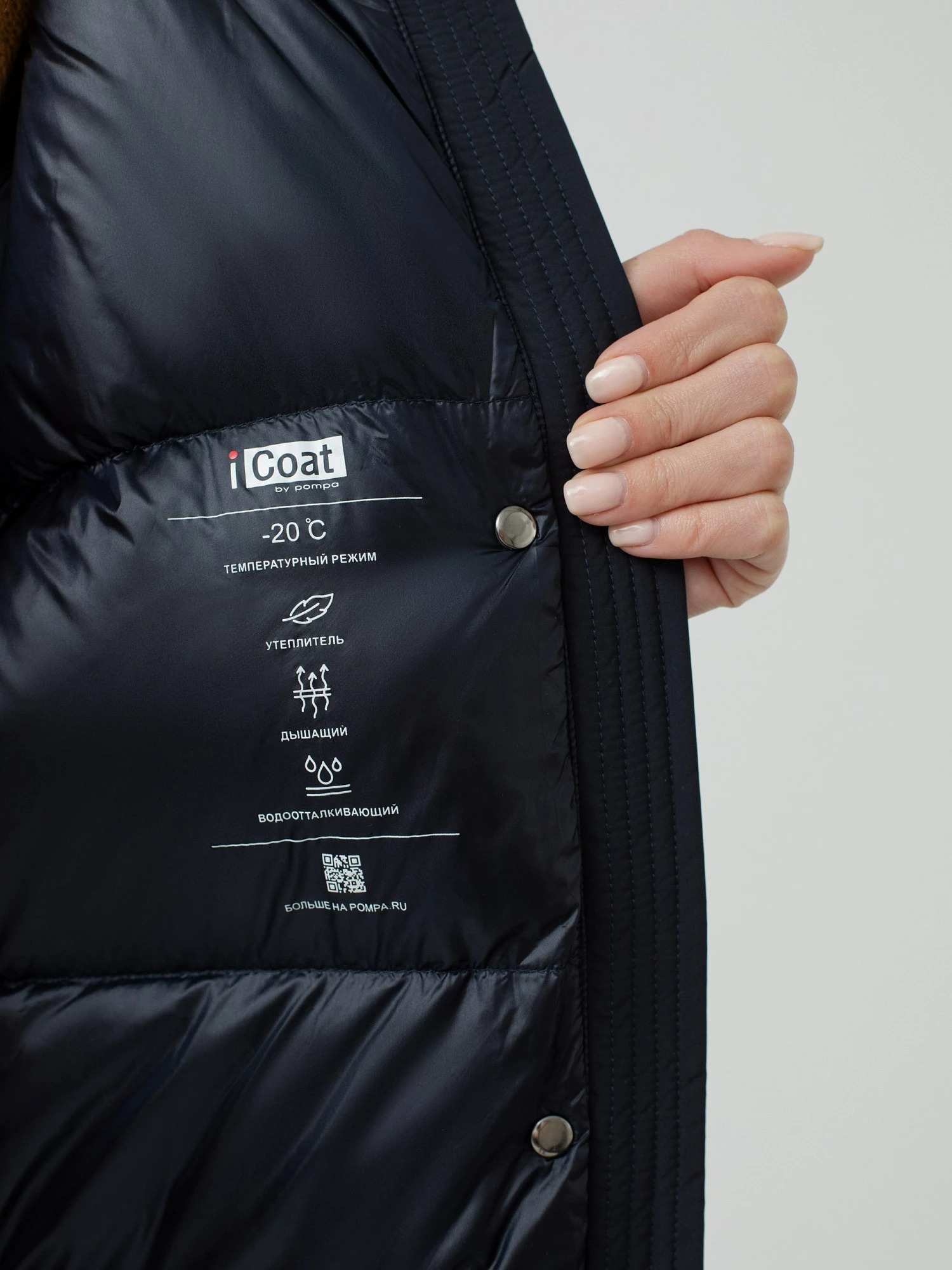 На сайте указаны российские размеры. Утепленное пальто прямого силуэта из плащевой ткани темно-синего цвета. Пальто произведено из премиальной плащевой ткани. В качестве утеплителя 90% пух и 10% перо. Комфортный рубашечный рукав, высокий воротник-стойка, что позволяет не использовать дополнительные теплые аксессуары, и при этом надежно сохраняет тепло. По низу рукава вязаная манжета в цвет основной ткани для дополнительного тепла. Длина пальто миди. Застежка на молнию и ряд потайных кнопок. В качестве дополнительного декора пояс-резинка на стильную металлическую пряжку, который дает возможность подчеркнуть силуэт. Внутренняя сторона пальто со стильной стежкой, которая переходит на лицевую сторону. Рост модели на фото - 175 см. Длина изделия - 123 см.