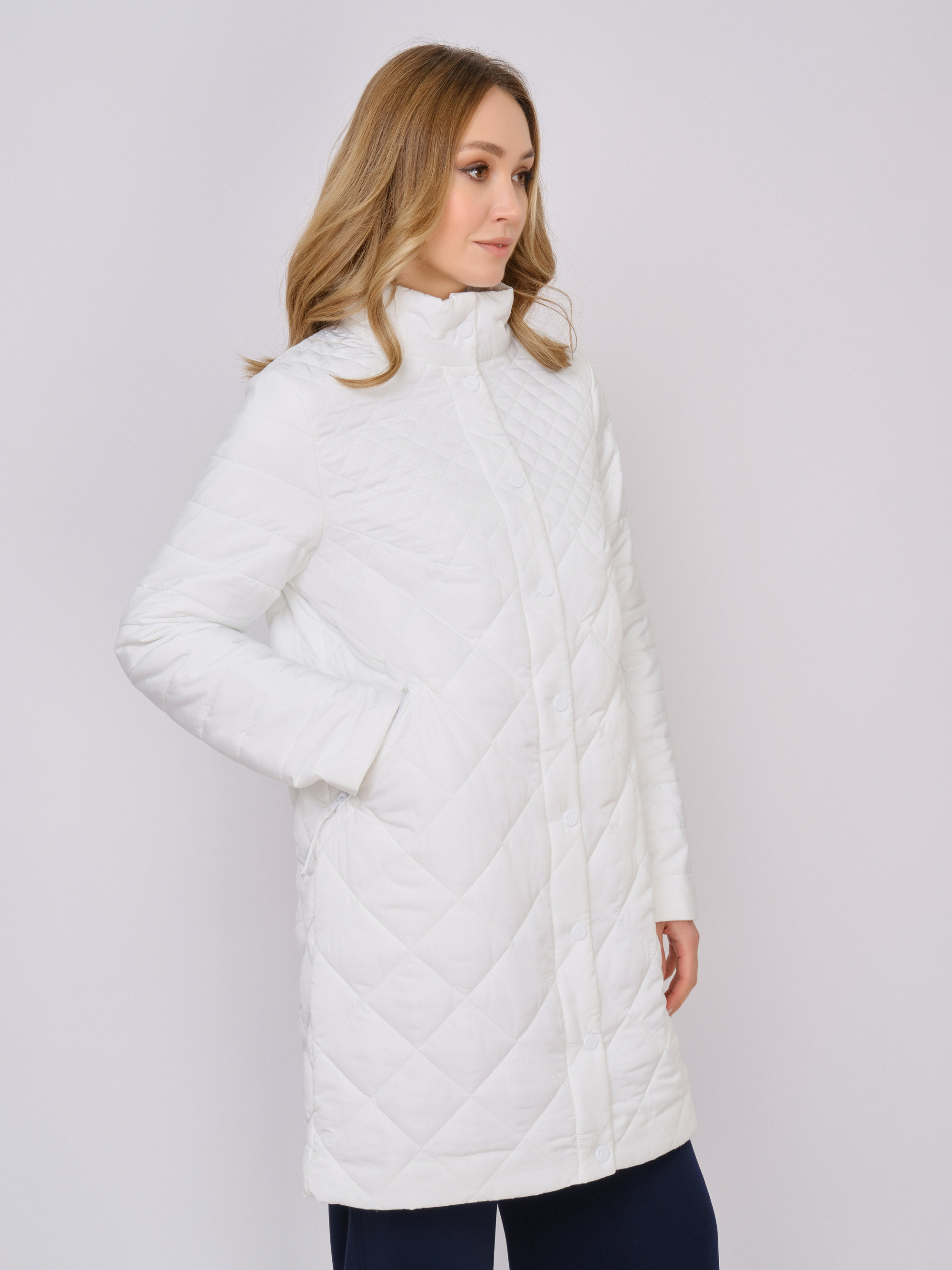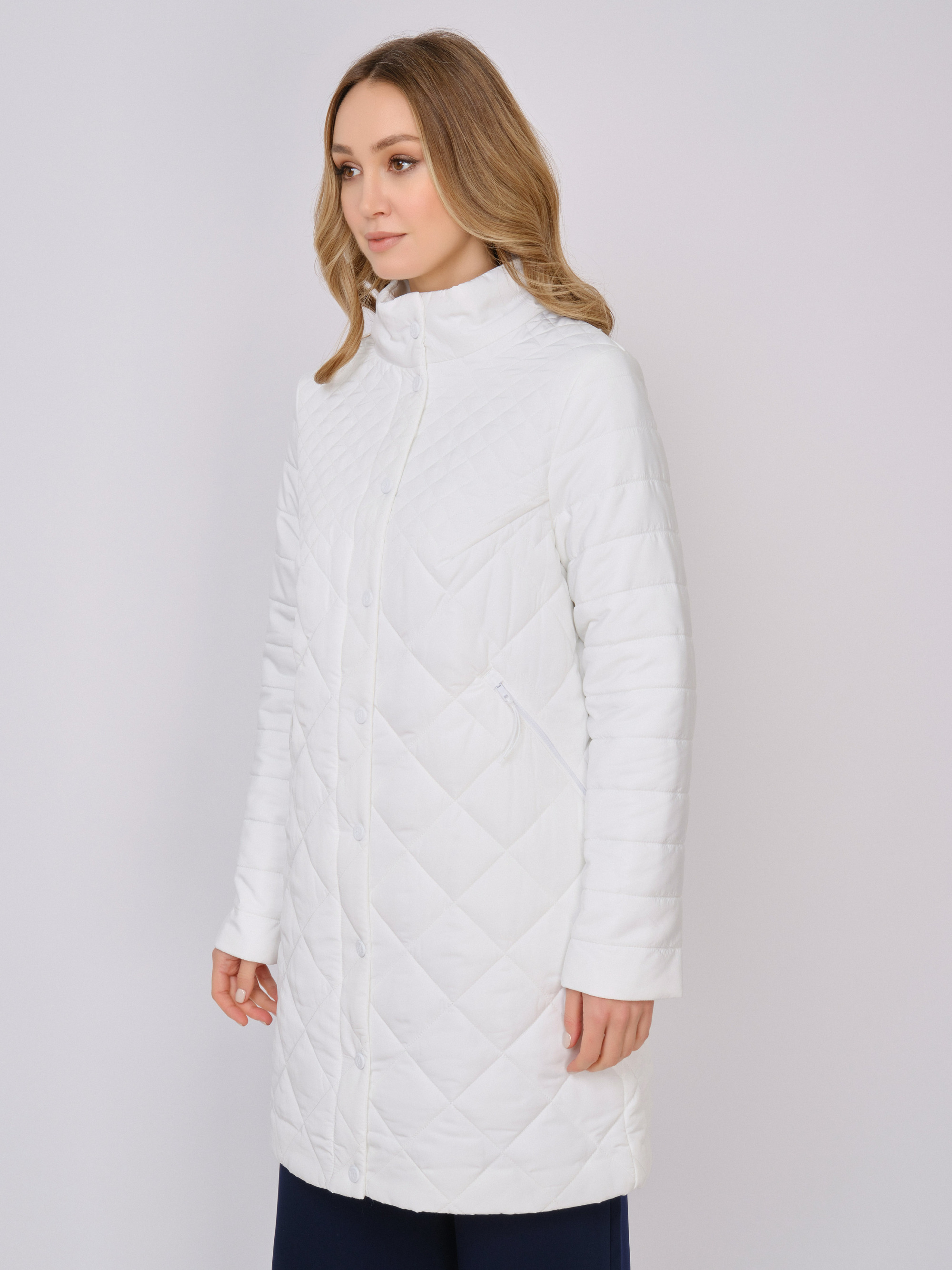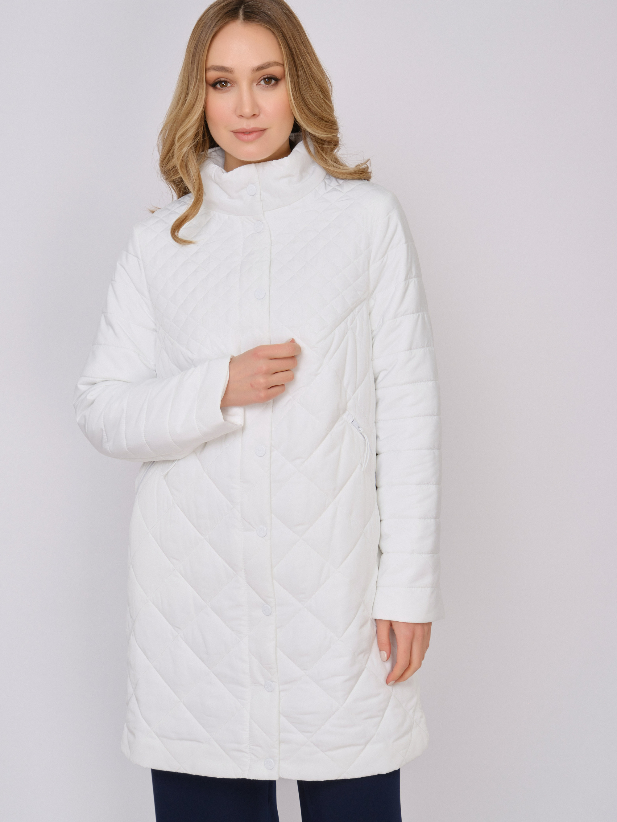 На сайте указаны российские размеры. Утепленное стеганое прямое белое полупальто на молнии, с длинным рукавом, с прорезными карманами на молнии. Длина по спинке: 90 см. Рост модели: 175 см.