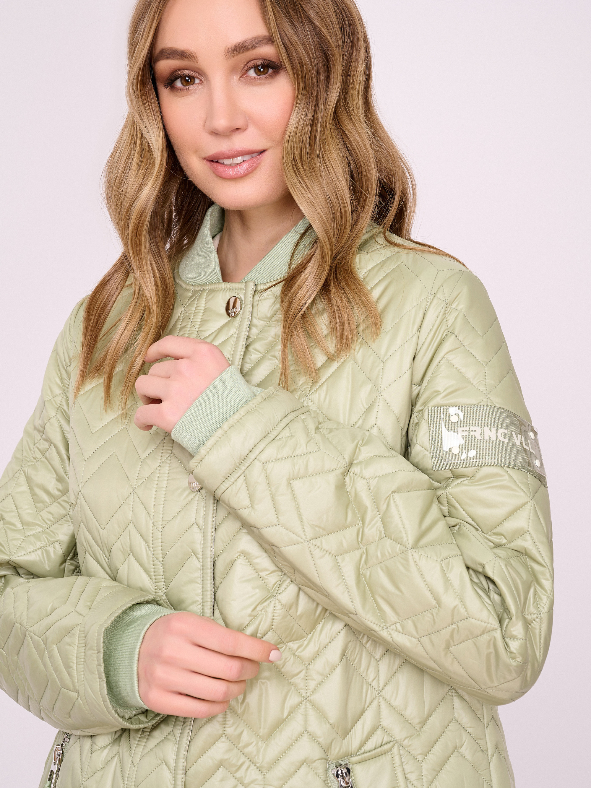 На сайте указаны российские размеры. Стеганное мятное пальто на молнии, с воротником-стойка, с длинным рукавом, с прорезными карманами на молнии, с боковыми разрезами на кнопках. Длина по спинке: 88 см. Рост модели: 175 см.