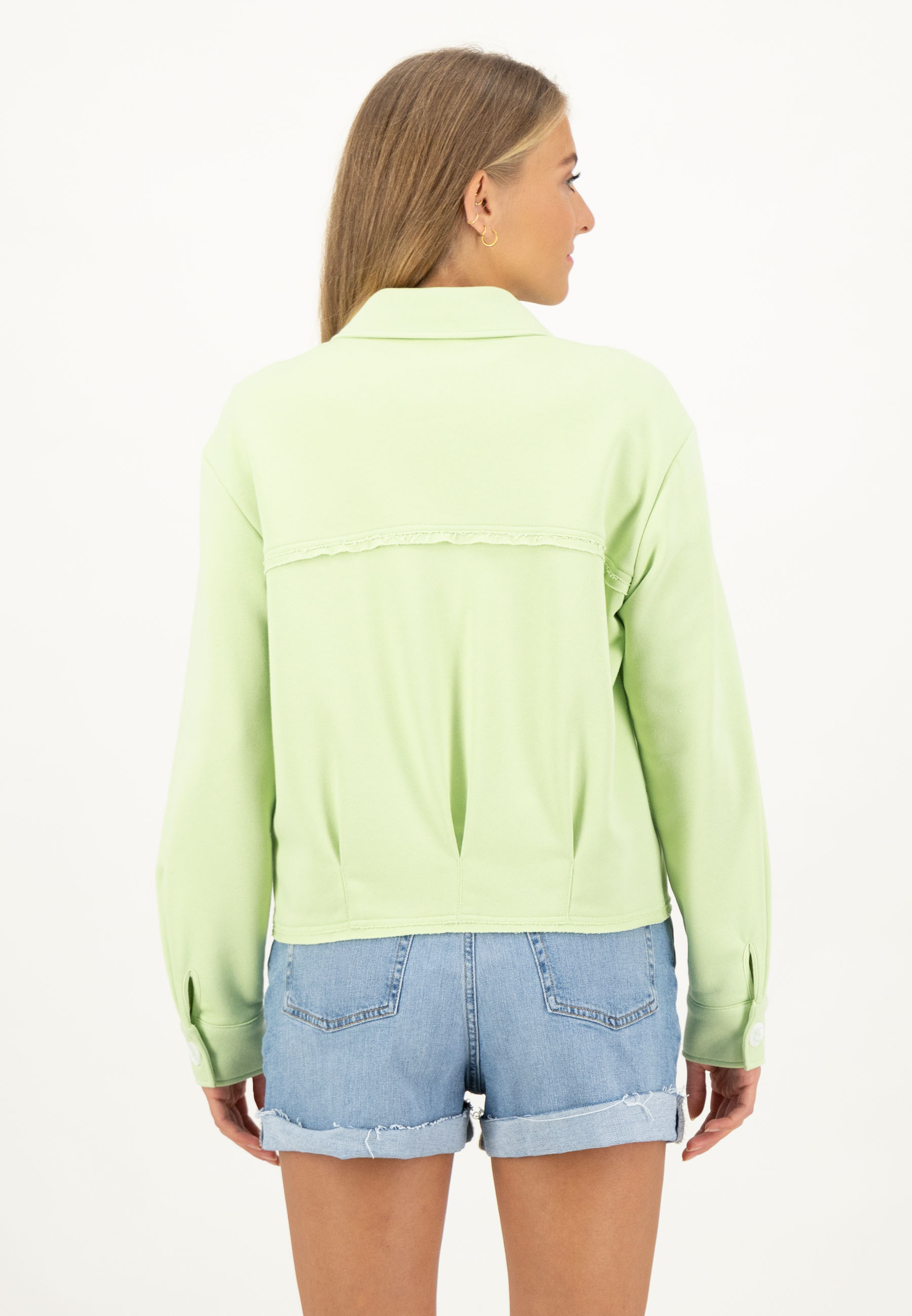 Жакет на пуговицах с разделительными швами и накладными карманами.