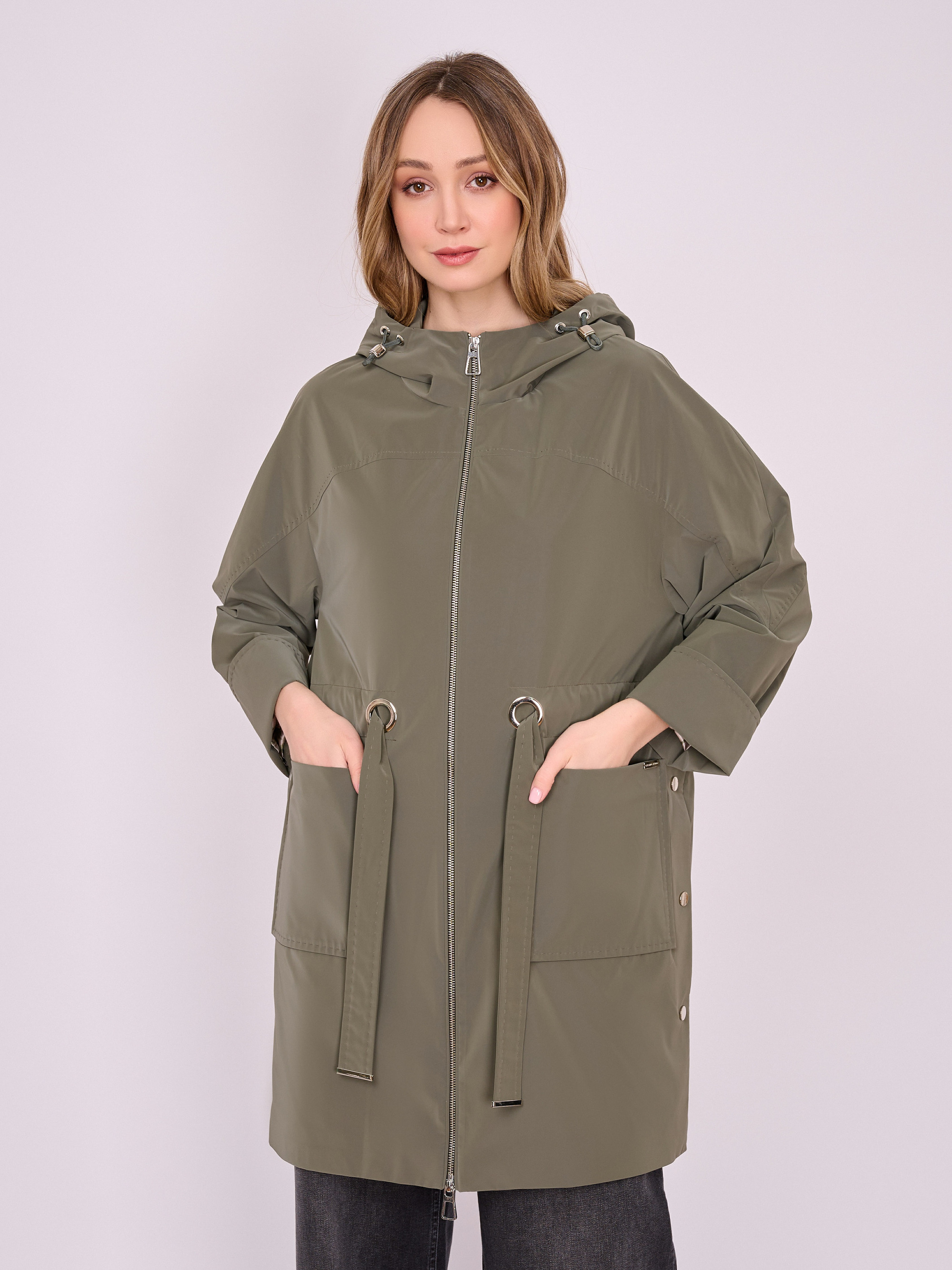 На сайте указаны российские размеры. Укороченный прямой плащ на молнии с капюшоном, длинными рукавами с отворотами, накладными карманами и кулиской по линии талии. Боковые разрезы застегиваются на кнопки. Длина по спинке: 90 см. Рост модели: 175 см.