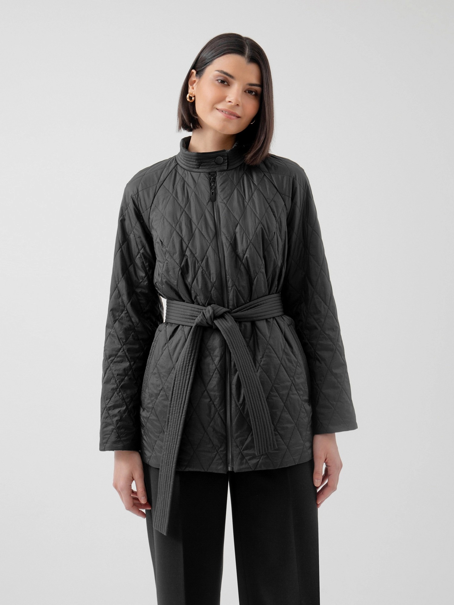 На сайте указаны российские размеры. Укороченная куртка из стеганой плащевой ткани в глубоком черном цвете. Куртка имеет высокий и комфортный воротник-стойку, надежную застежку на тракторную молнию и пояс из основной ткани в комплекте, который позволяет сделать силуэт еще более женственным и подчеркнуть талию. Длина изделия: 72 см. Рост модели 175 см.