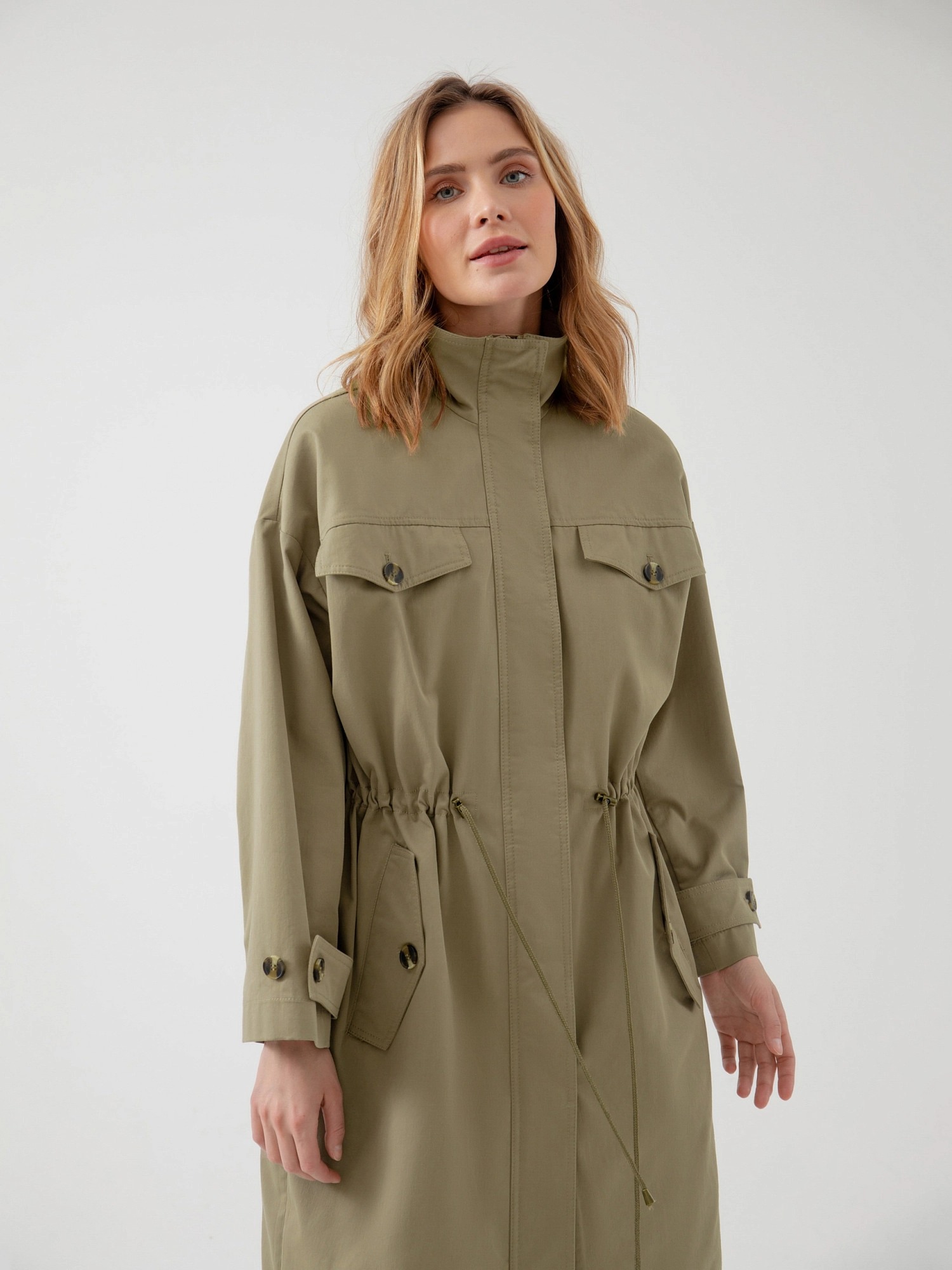 На сайте указаны российские размеры. Плащ прямого силуэта из премиальной плащевой ткани в цвете "серебряный шалфей". Плащ имеет кофмортный воротник-стойку, который не только очень стильно выглядит, но и защищает от сильного ветра. В области талии плащ имеет кулиску со шнуром, который с легкостью регулирует посадку и делает силуэт как более прилегающим, так и свободным. Тренч имеет четыре кармана с клапанами, которые не только очень функциональные, но и служат дополнительным декором. Спущенный рубашечный рукав очень комфортный и дает возможность с легкостью надевать первым слоем более объемные вещи, не стесняя при этом движений. Длина изделия: 111 см. Рост модели 175 см.