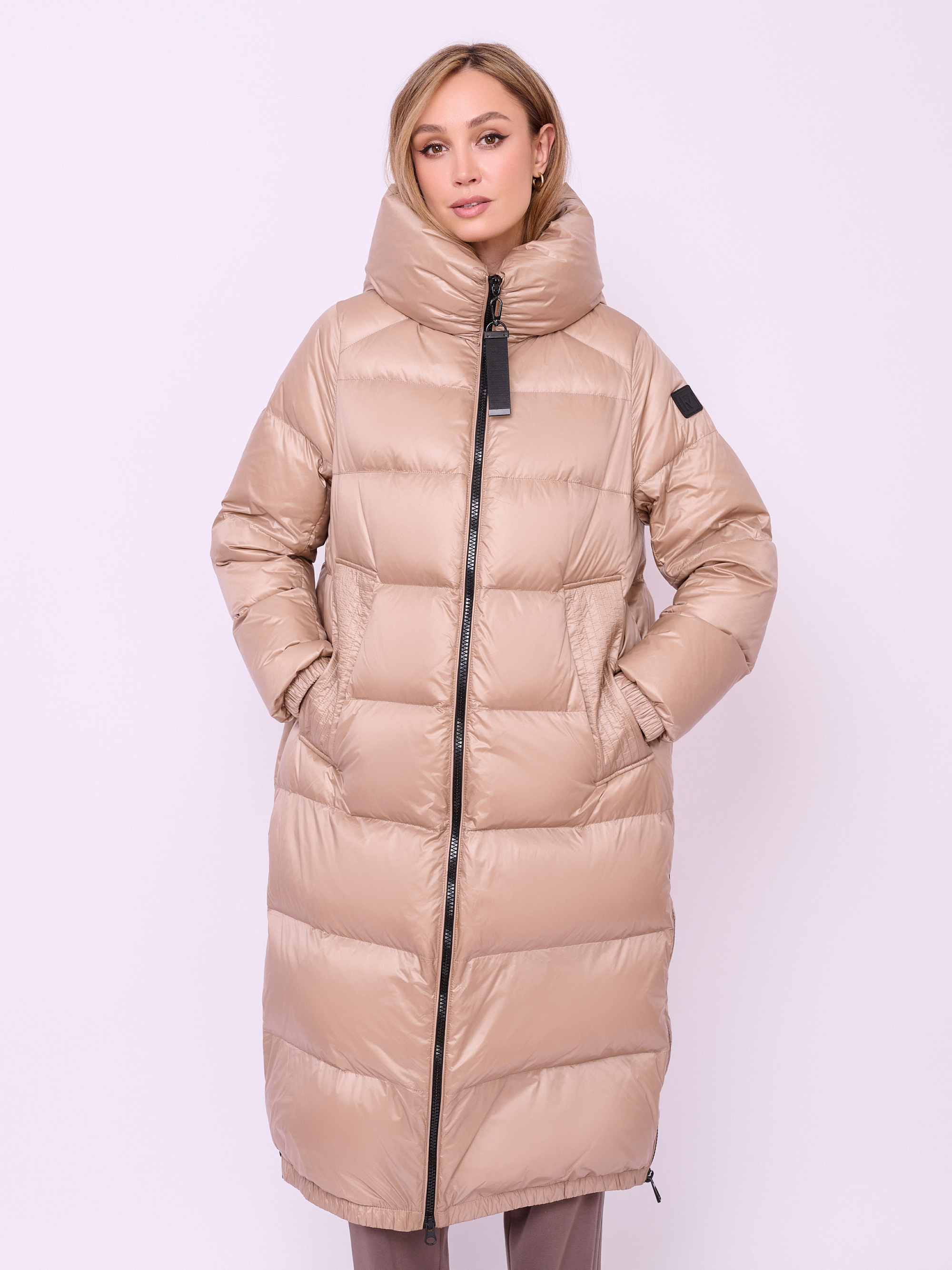 Пальто-пуховик стеганое с высоким воротом, несъемным капюшоном на кулиске без опушки, с длинными рукавами на резинке, прорезными карманами на магнитной кнопке, высокими разрезами на молнии и низом на резинке. Длина по спине: 112 см