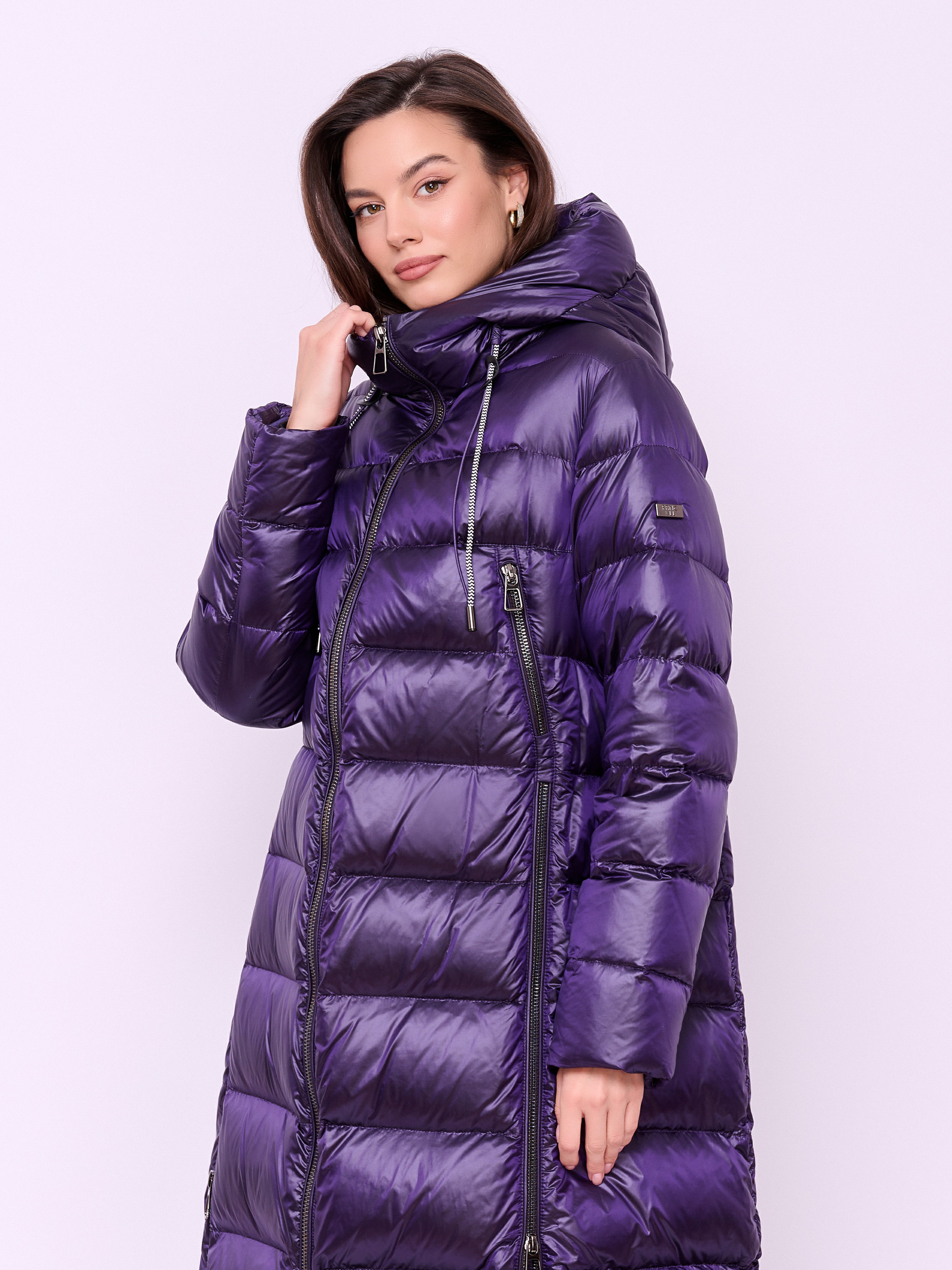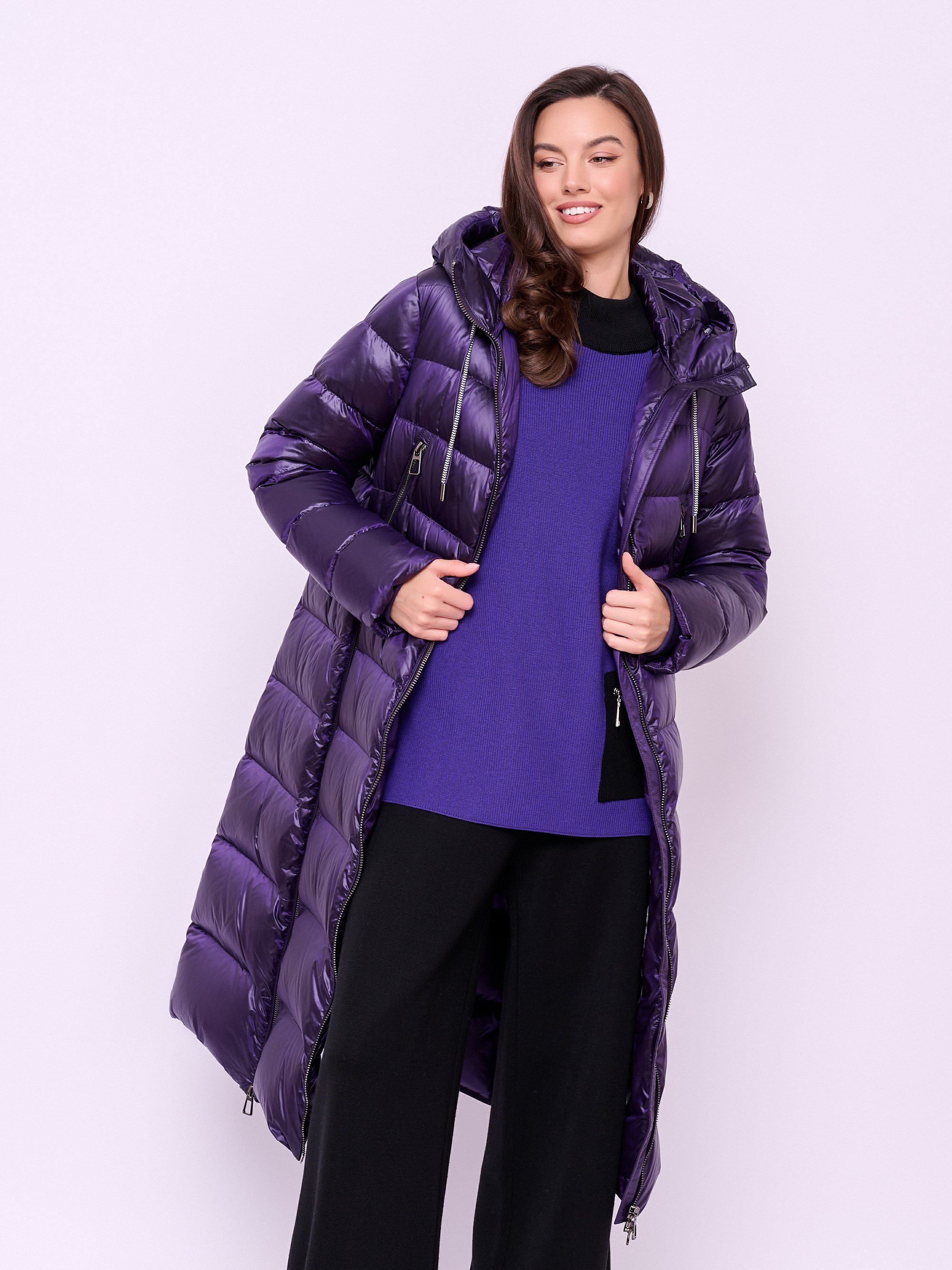 Пальто-пуховик стеганое с высоким воротом, несъемным капюшоном на кулиске, без опушки, с длинными рукавами-реглан с трикотажными манжетами, прорезными карманами на молнии и длинными разрезами на молнии. Длина по спине: 111 см.