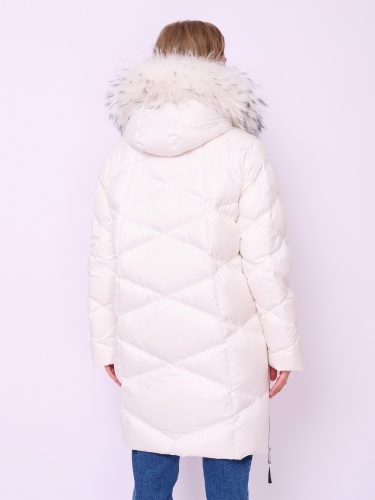 Стеганая куртка-пуховик на молнии и кнопках с высоким воротом, несъемным капюшоном со съемной опушкой из меха енота, длинными рукавами-реглан, прорезными карманами на молнии и высокими боковыми разрезами на молнии. Длина по спинке: 92 см.