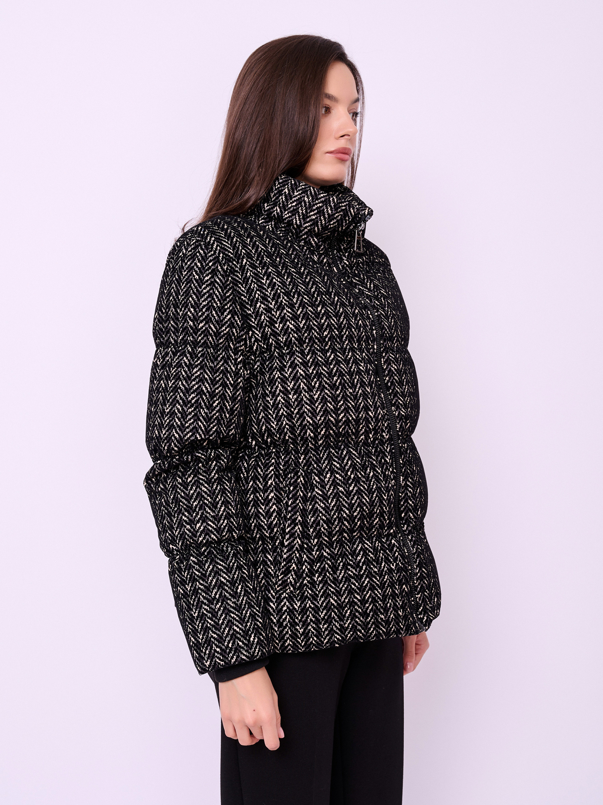Утепленная куртка из фактурной ткани на молнии с высоким воротом, без капюшона, с длинными рукавами с трикотажными манжетами, прорезными карманами и кулиской по низу изделия.