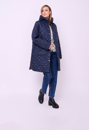 Утепленное стеганое пальто прямого покроя средней длины с воротником-стойкой, съемным капюшоном-манишкой, длинными рукавами на кнопках, накладынми карманами и рукавицами из основного материала. Длина по спинке: 92 см