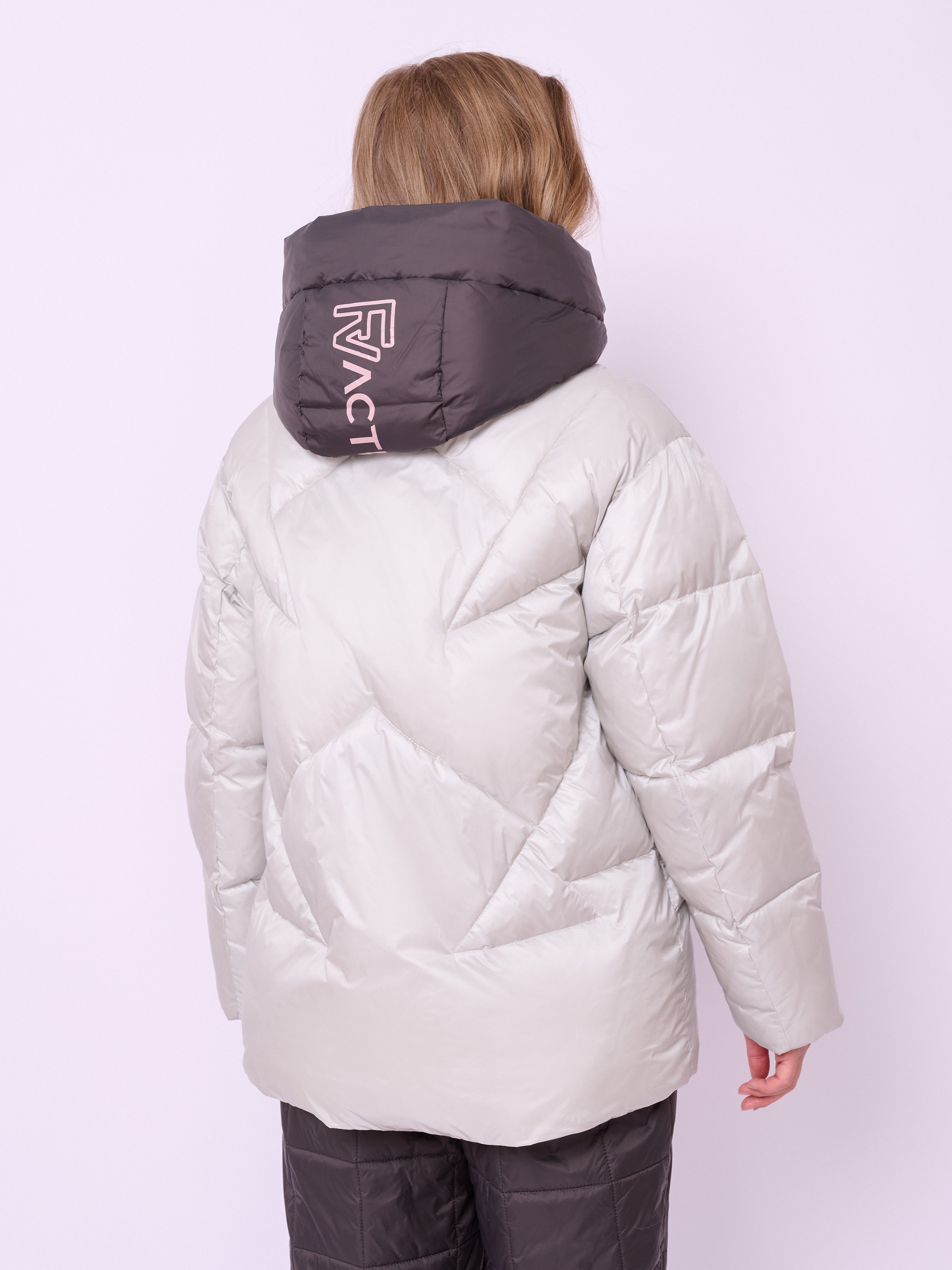 Куртка утпеленная стеганая на молнии и кнопках со съемной манишкой с капюшоном на кулиске, без опушки, с длинными рукавами с трикотажными манжетами, прорезными карманами на кнопках и кулиской по низу.