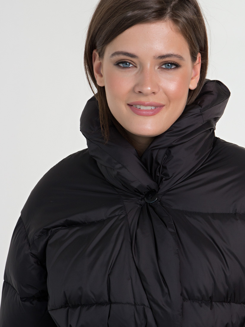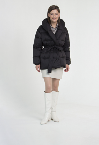 Куртка женская с поясом, выполнена из мягкой ткани с внутренним свечением. Объемный силуэт с акцентной линией плеч и шалевыми лацканами помогает произвести впечатление. С помощью потайной пуговицы, ворот удобно прилегает к шее, защищая от ветра. Центральная застежка двубортная на кнопки, боковые прорезные карманы застегиваются на молнию. Длина: 76 см.