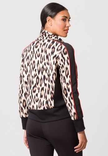 Легкая женская куртка с воротником стойкой и принтованными атласными лентами. Животные принты вряд ли когда-нибудь выйдут из моды, поэтому эта легкая куртка станет вечной модной классикой. Модный дизайн дополняется матовой блестящей тканью и контрастной окантовкой рукавов. Воротник-стойка выглядит стильно благодаря декоративным атласным лентам с принтом. Удобная куртка из джерси, которая подчеркнет спортивный, гламурный повседневный образ.