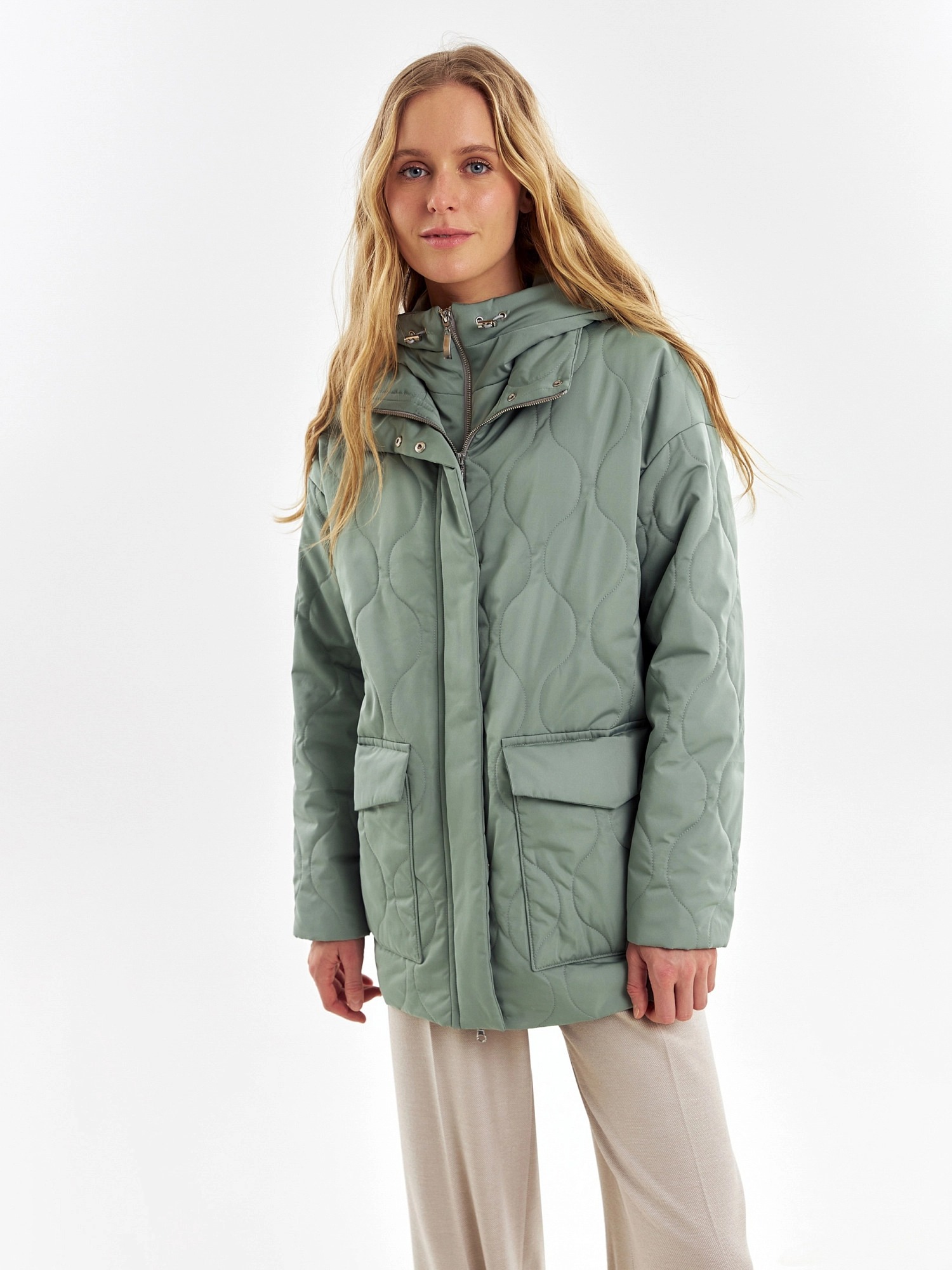 Короткая весенняя куртка из стеганой плащевой ткани в ультрамодном цвете "зеленый айсберг". Куртка имеет прямой силуэт, комфортный рубашечный рукав и высокий воротник-стойку. По бокам располагаются глубокие накладные карманы с клапанами. Застегивается изделие на молнию и установочные кнопки. В комплекте с курткой предлагается съемный капюшон с короткой манишкой. Капюшон, а также карманы и планка куртки выполнены из плащевой ткани-компаньона в цвете основной.