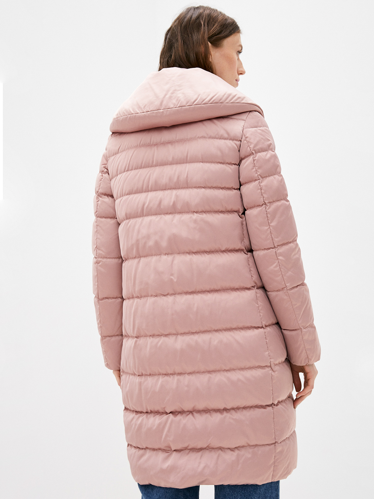 Однотонные зимнее пальто в пыльно-розовой расцветке. Натуральный пуховый наполнитель с добавлением пера. Застежка на молнию, ветрозащитная планка. Воротник стойка. Два боковых кармана с листочкой, плюс внутренний карман.